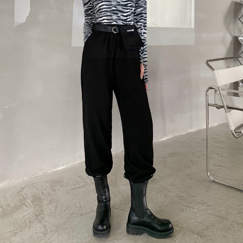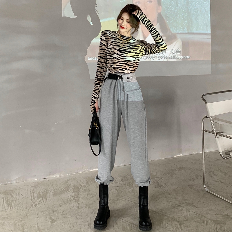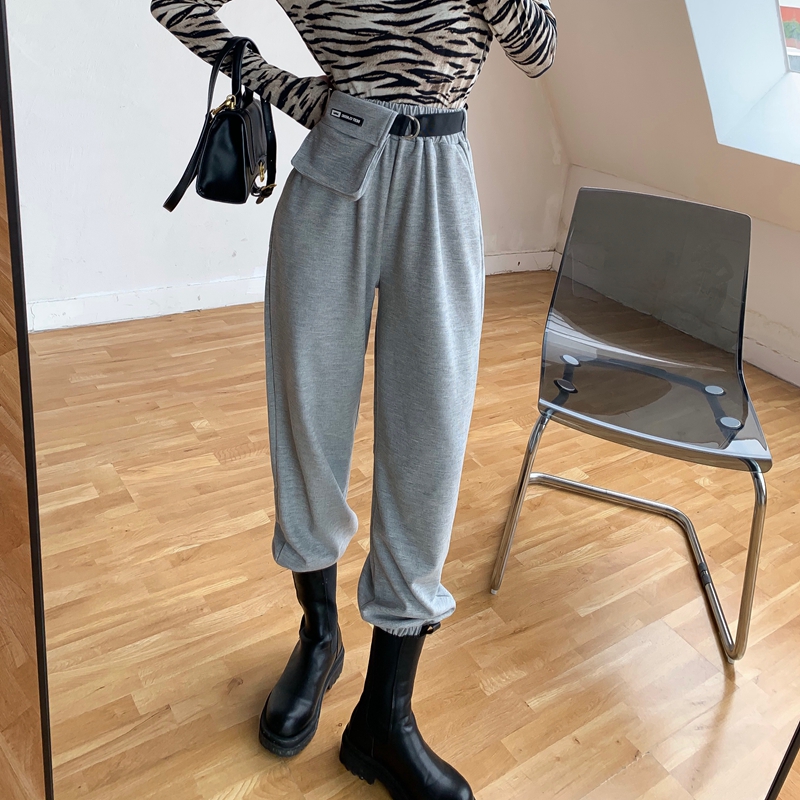 실제 홍콩 스타일 성격 스포티 하이 허리 느슨한 넥타이 스포츠 바지 그레이 캐주얼 스웨트 셔츠/허리 가방 트렌디