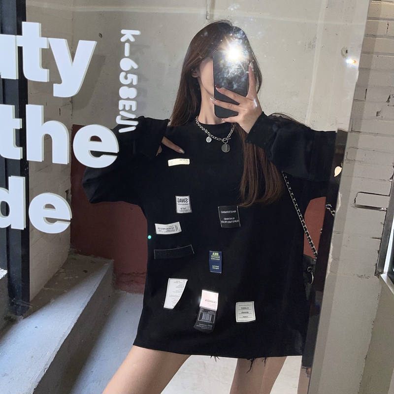 실제 봄 뉴스 스타일 홍콩 스타일 성격 불규칙한 트렌디 한 멋진 우표 흑백 느슨한 풀오리 풀 오버 긴팔 티셔츠 탑