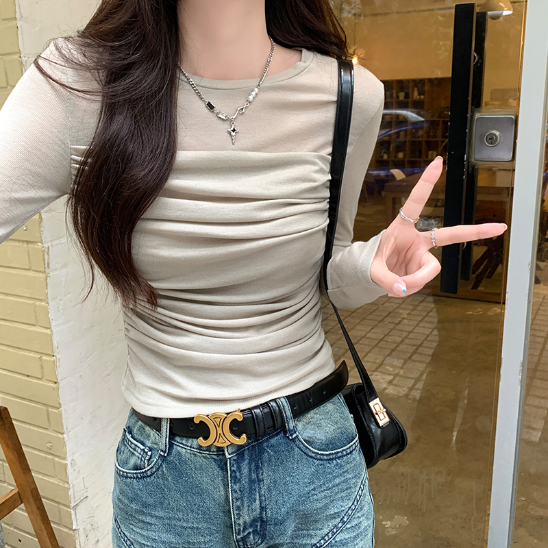 여성용 가을 스타일 디자인 틈새 주름 슬림베이스 셔츠 짧은 탑 트렌디