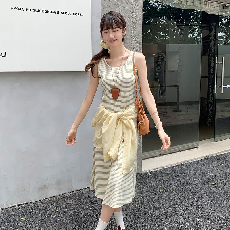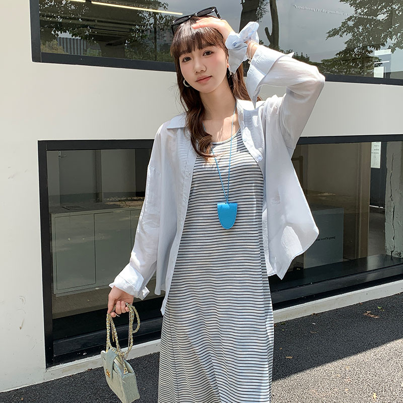 여성용 폴란드 폴리 칼라 스트라이프 서스펜더 드레스 2025 여름 선 스크린 셔츠 기질 긴 치마 2 피스 세트