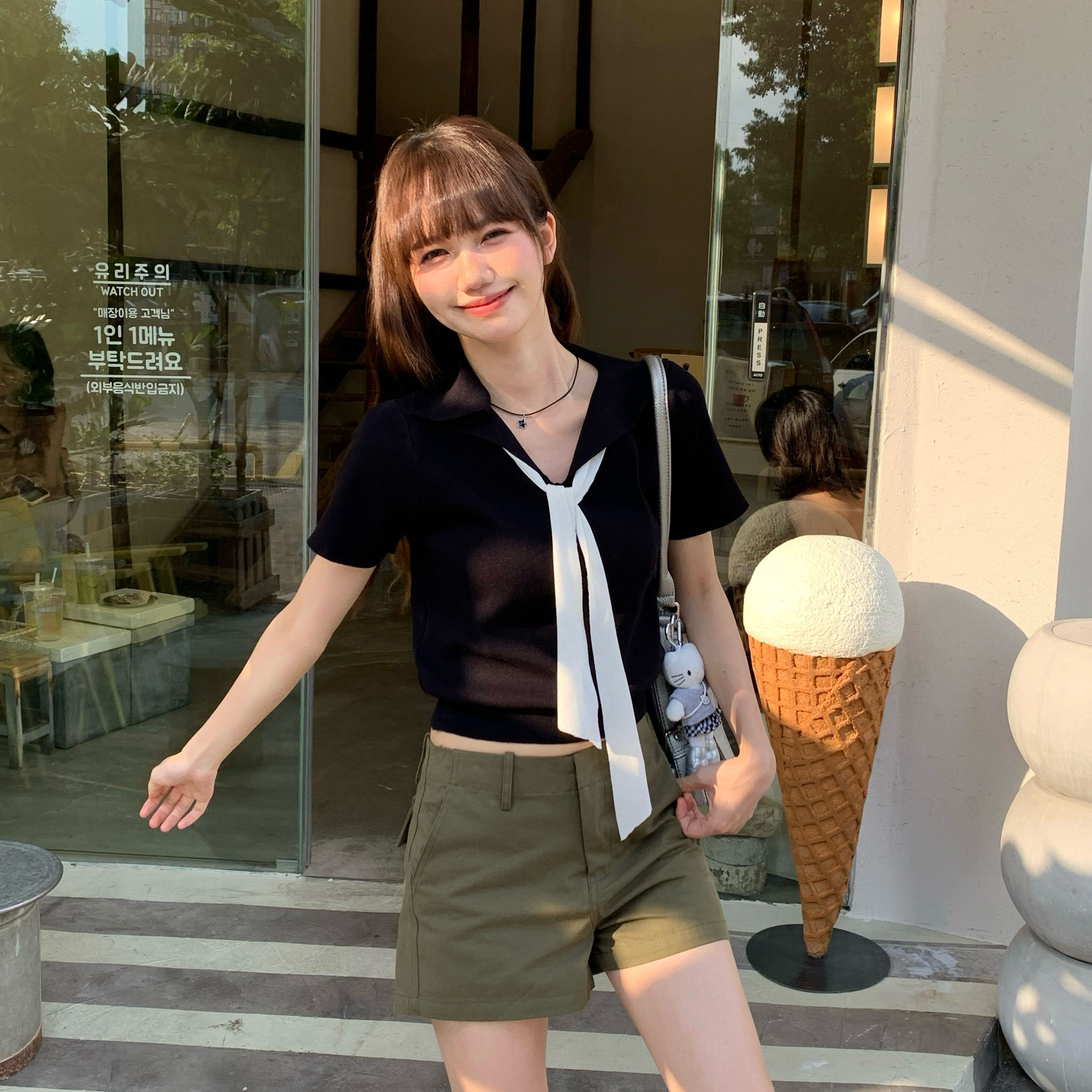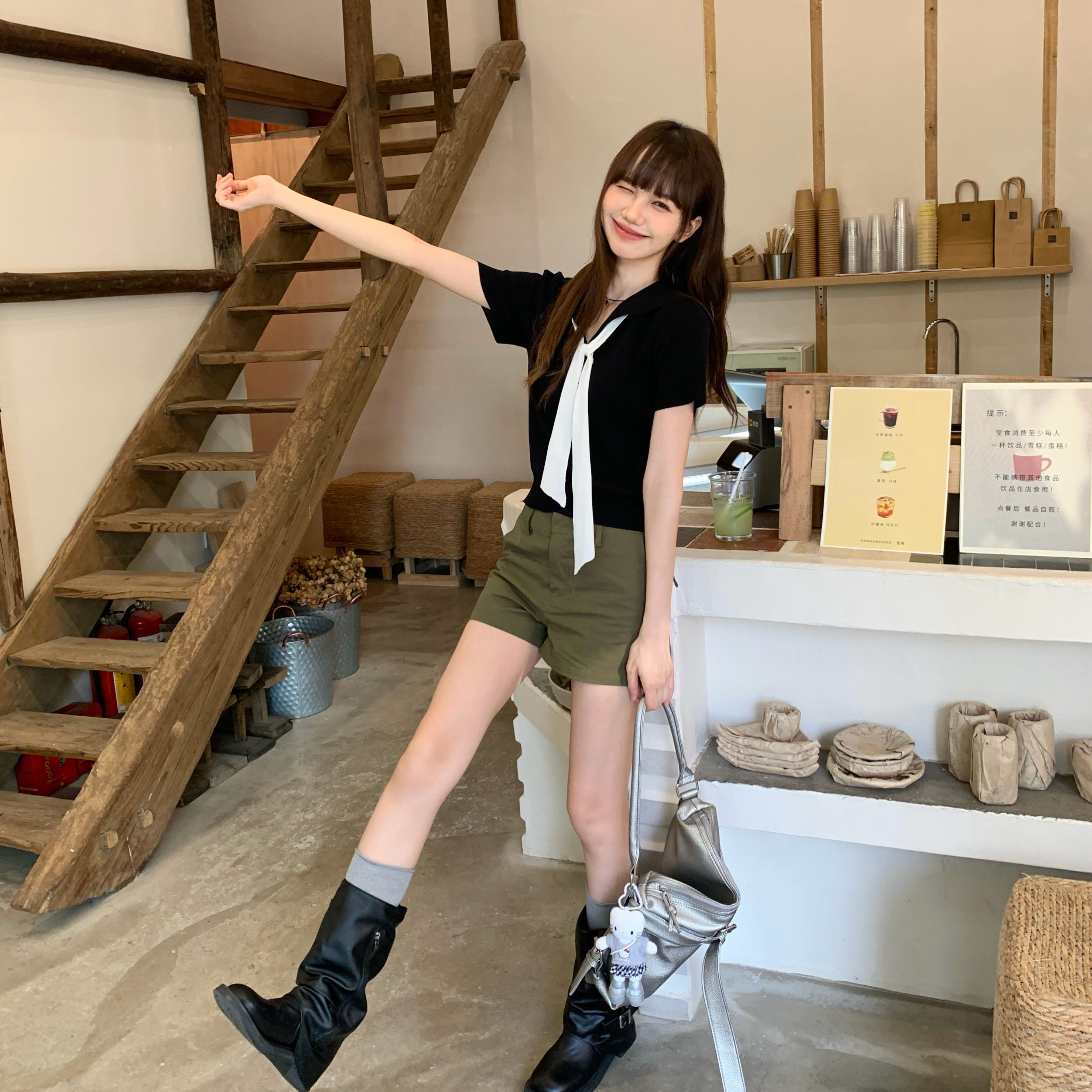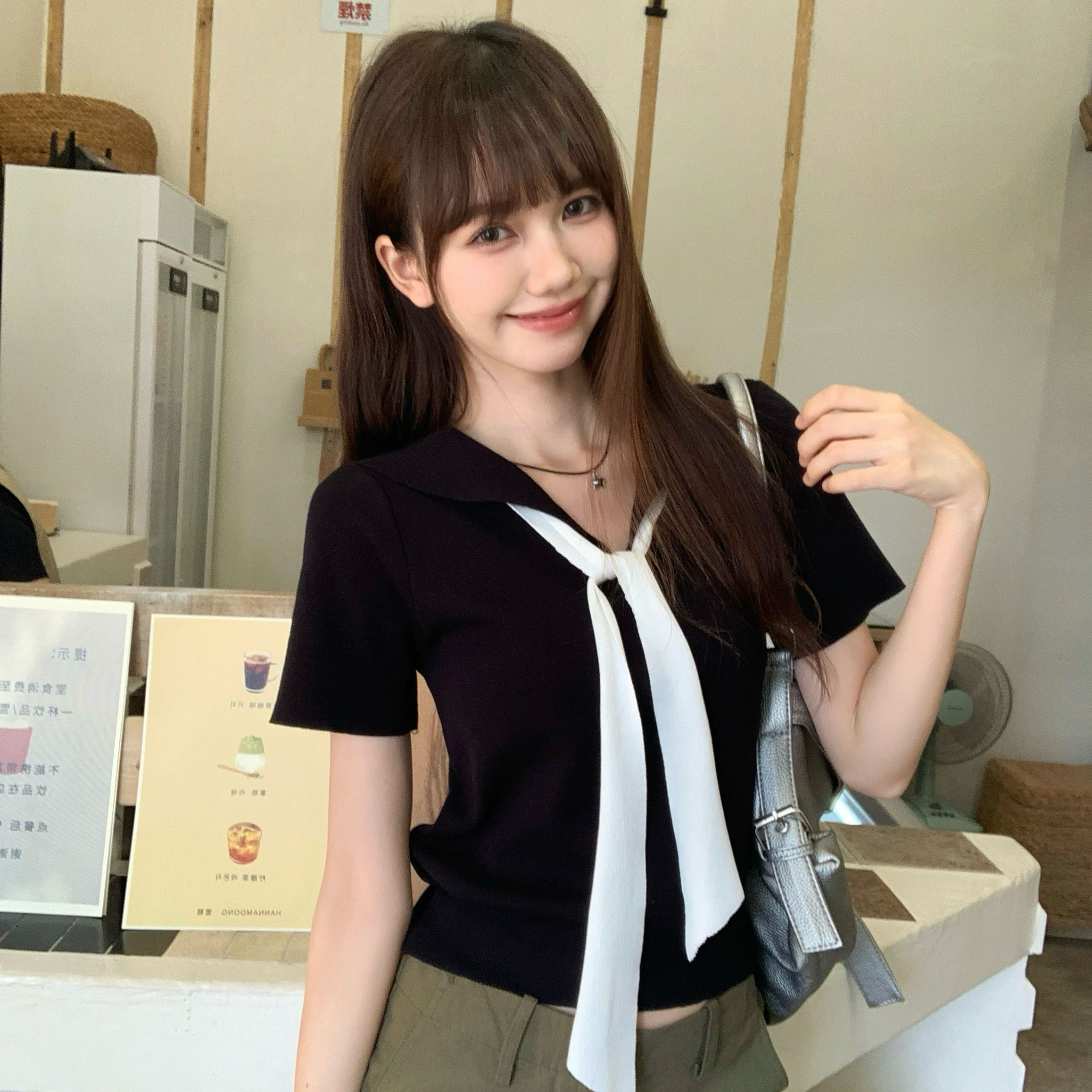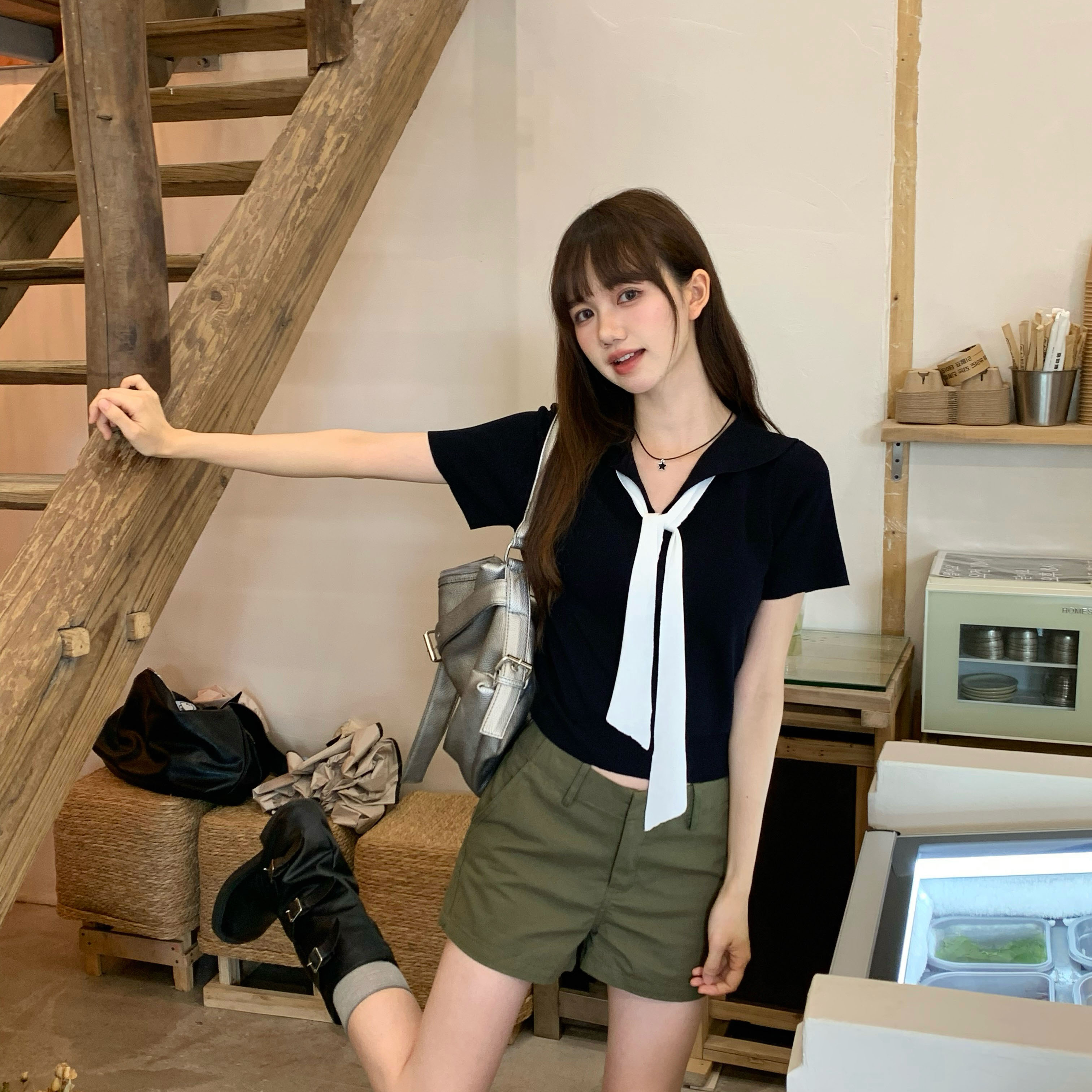 실제 가격#American Retro Black Navy Collar Strap Front Should Short-Sleeved 티셔츠 여성의 여름 슬림 핏 슬림 셔츠