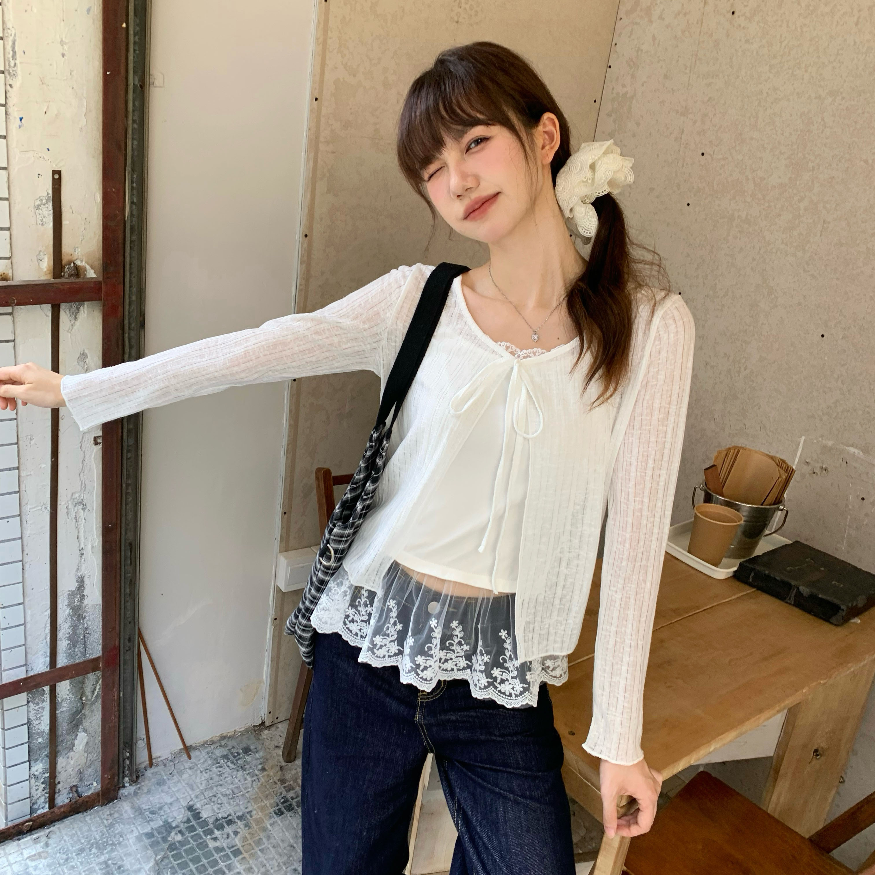실제 가격#여성용 흰색 얇은 레이스 업 니트 카디건 2025 가을 새로운 느슨한 선 스크린 재킷 쇼트