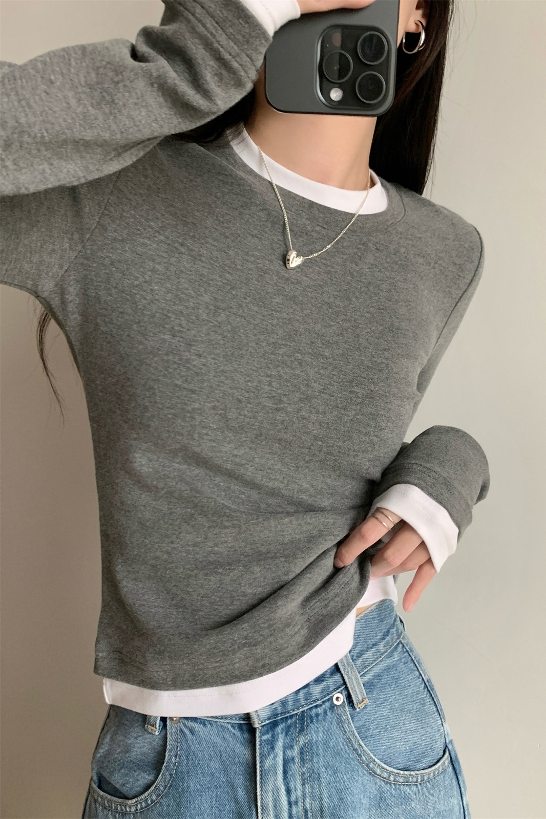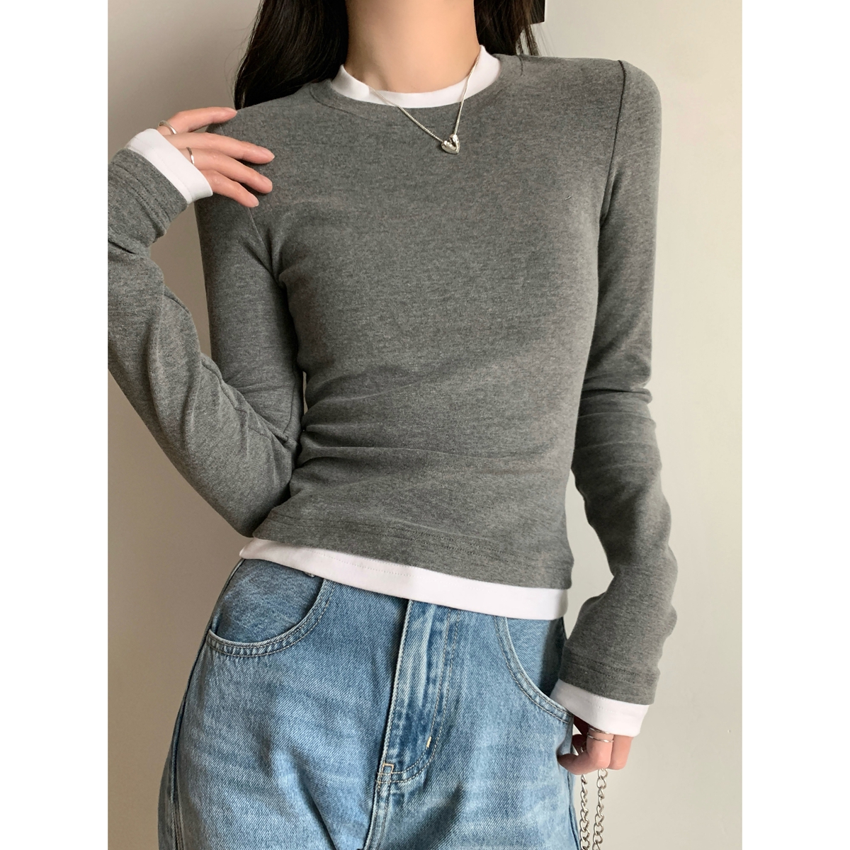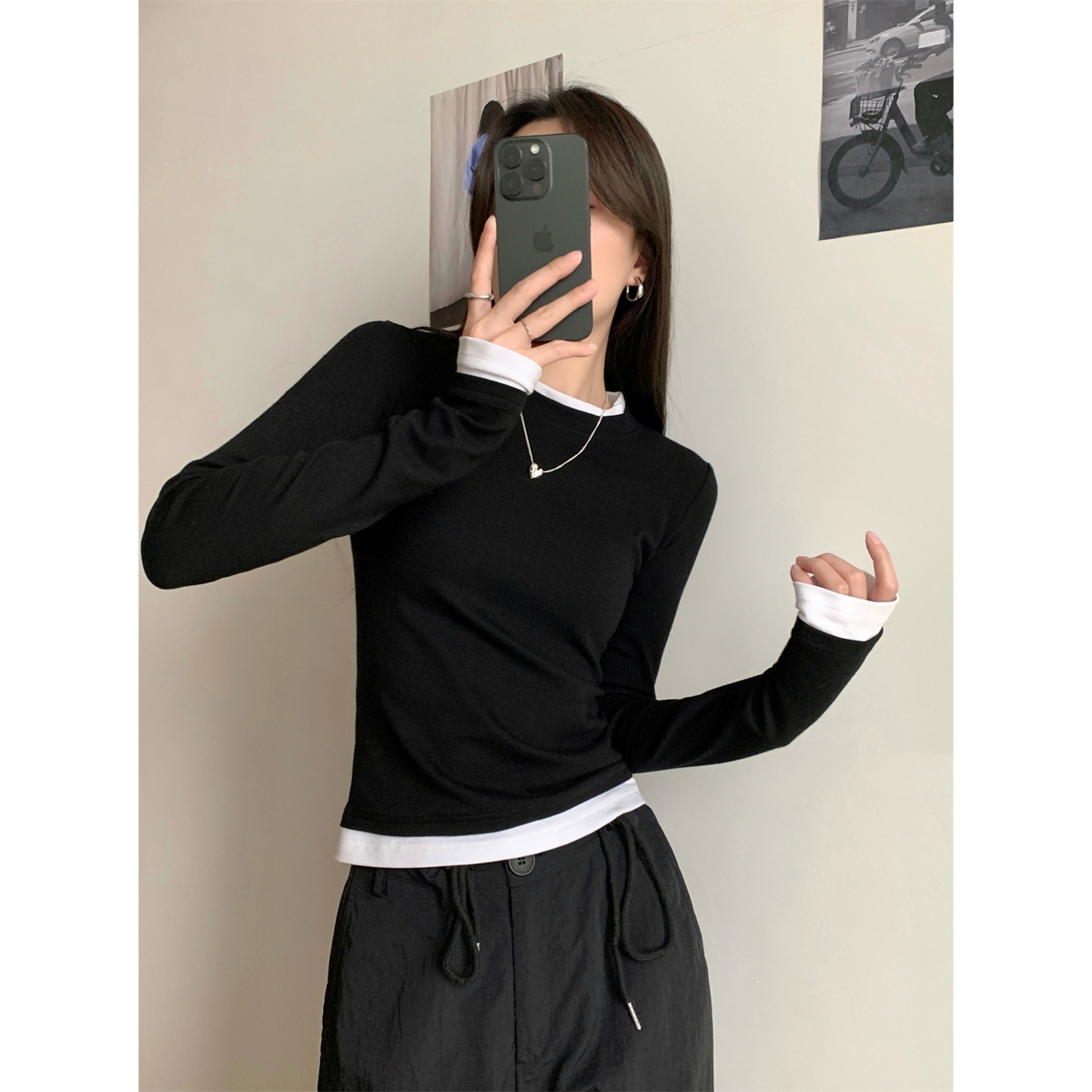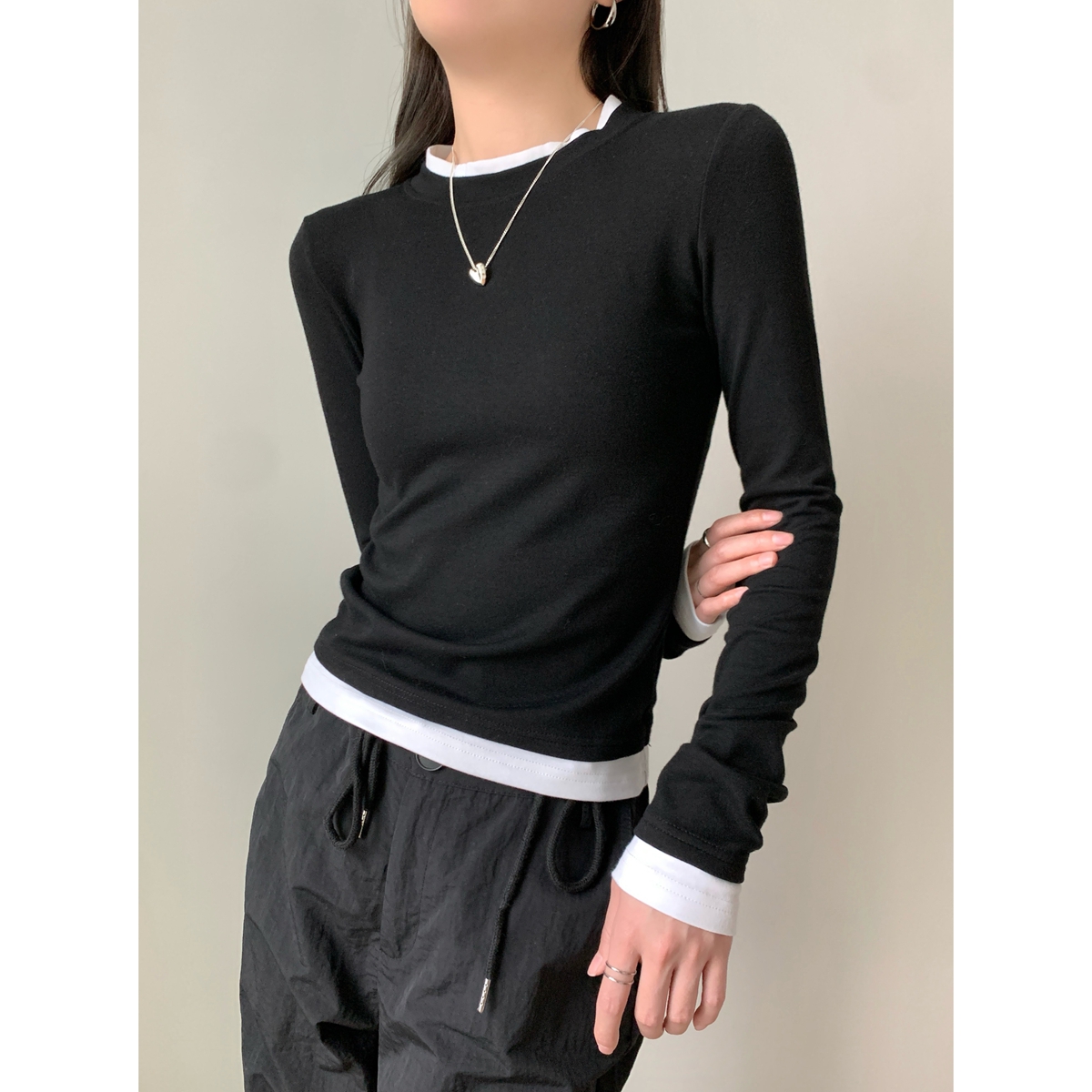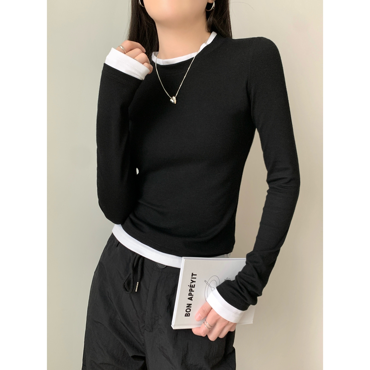 실제 사진과 실제 가격. 이른 가을의 새로운 한국 버전 대조 컬러 가짜 2 피스 슬림 한 목 목마 순수면 긴 소매 티셔츠 여성을위한