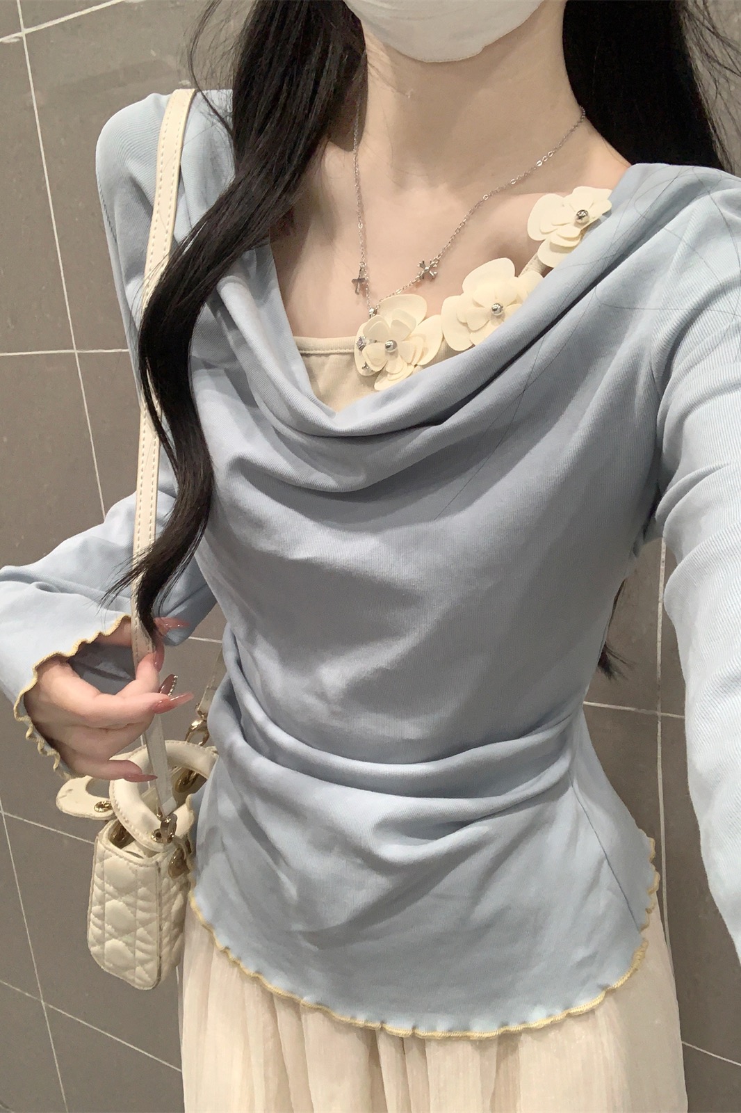 실제 사진 및 실제 가격 가을 한국 버전 디자인 3 차원 꽃 오프 숄더 가짜 2 피스 슬림 긴팔베이스 티셔츠 탑