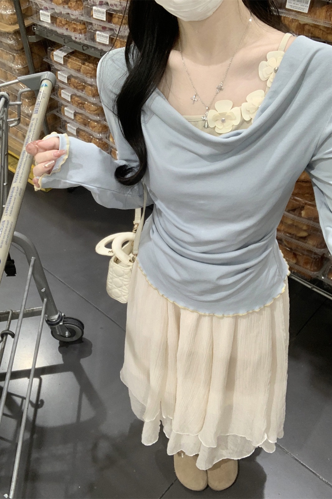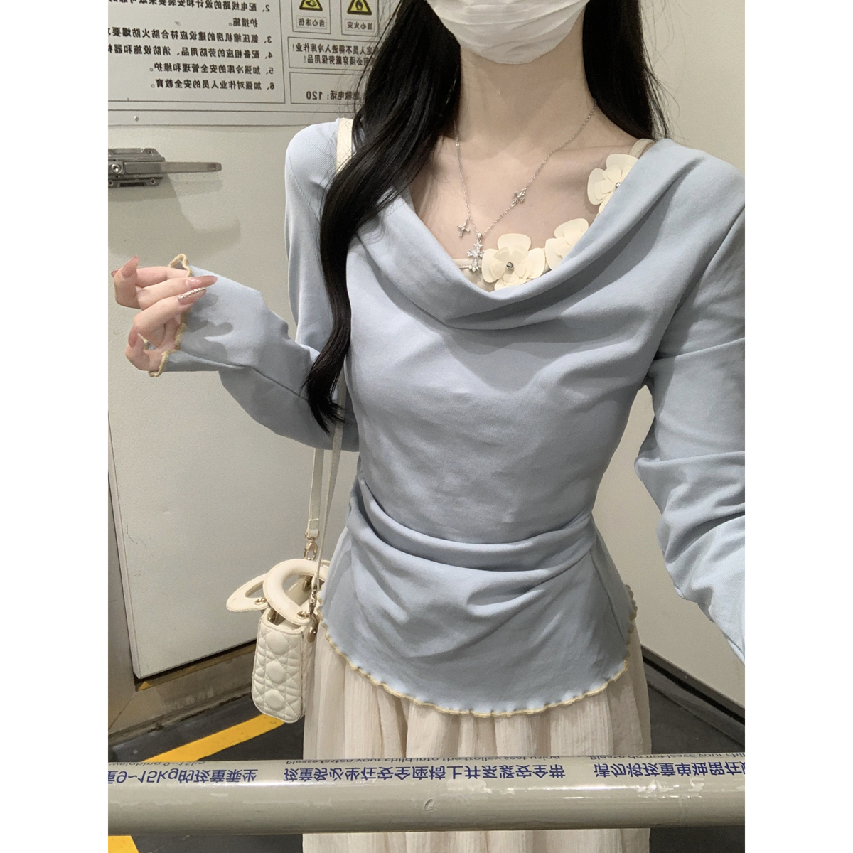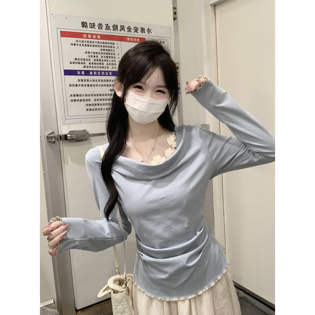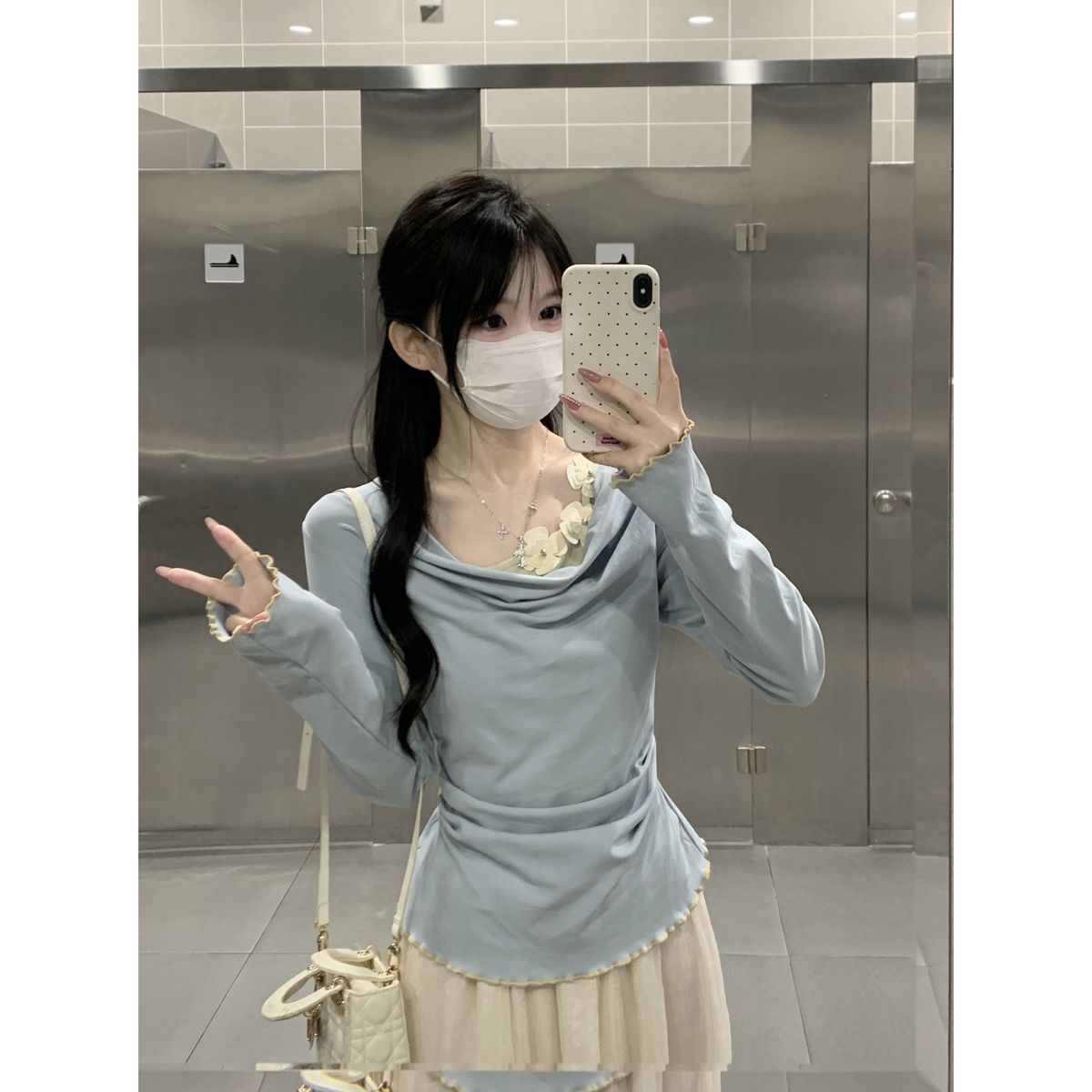 실제 사진과 실제 가격. 옆 어깨, 3 차원 꽃, 슬림 한, 긴 소매 티셔츠가있는 순수 욕망 목선의 이른 가을 한국 버전