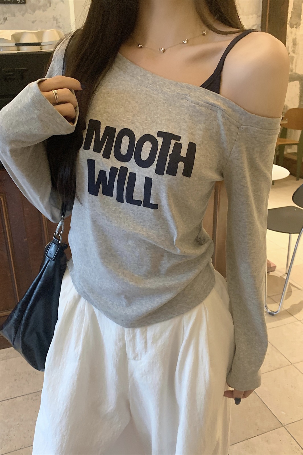 실제 사진 및 실제 가격 가을 가을 한국 버전의 뜨거운 여자 오프 숄더 문자 인쇄 슬림 허리 톱니 허리 슬림 티셔츠 탑