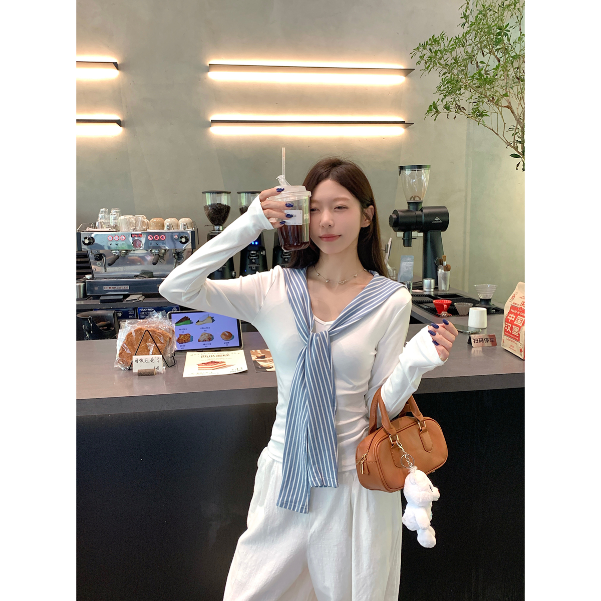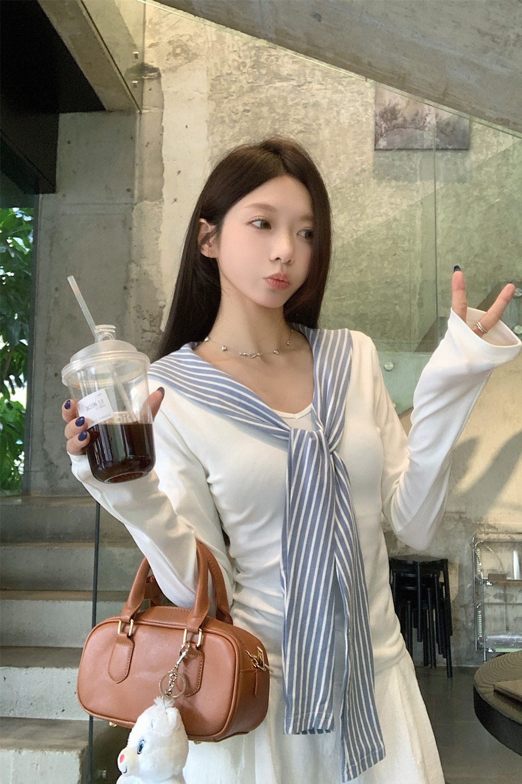 실제 샷과 실제 가격. 이른 가을 한국 스타일 슬림 v- 넥 숄 스트라이프 타이 긴 슬리브베이스 티셔츠 여성을위한
