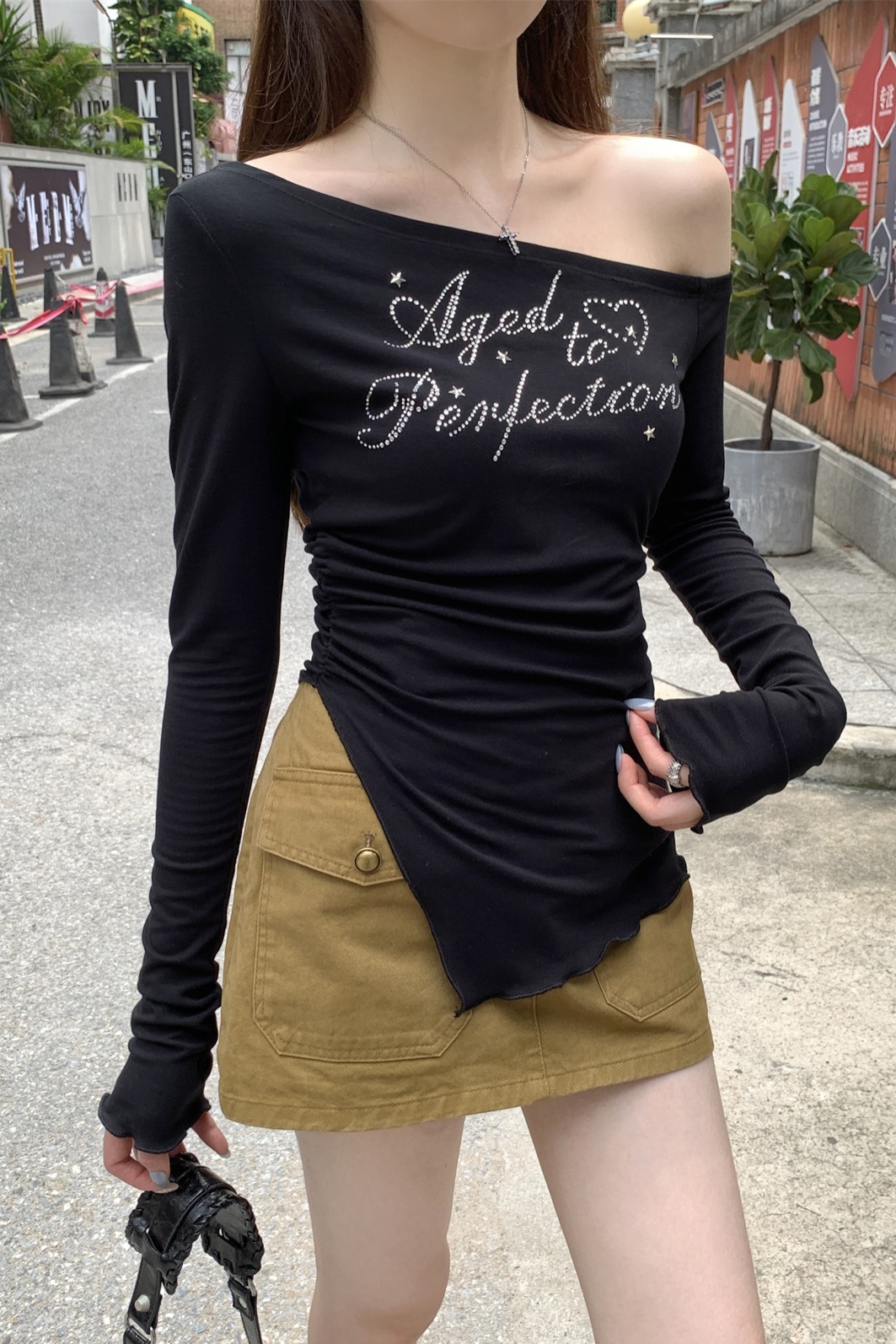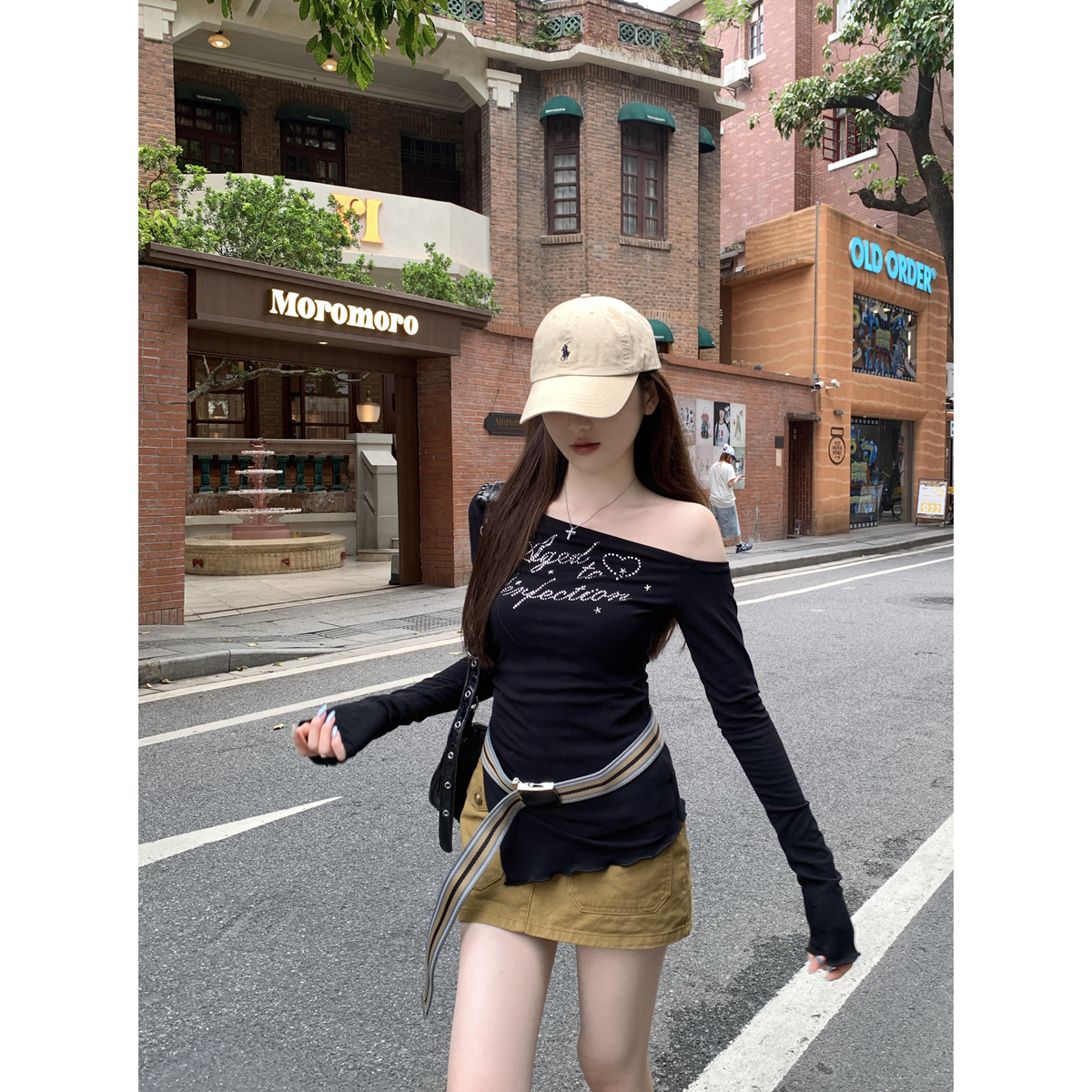 실제 샷과 실제 가을 가을 한국어 버전의 오프 숄더 불규칙한 글자와 슬림하고 오프 숄더 탑이있는 긴 소매 티셔츠
