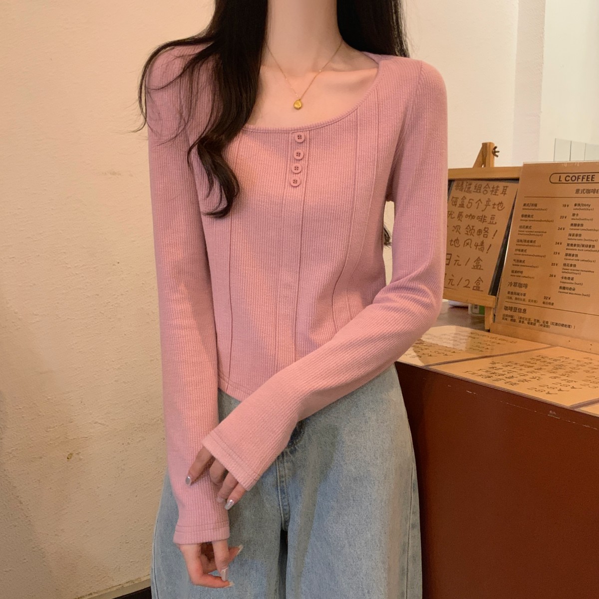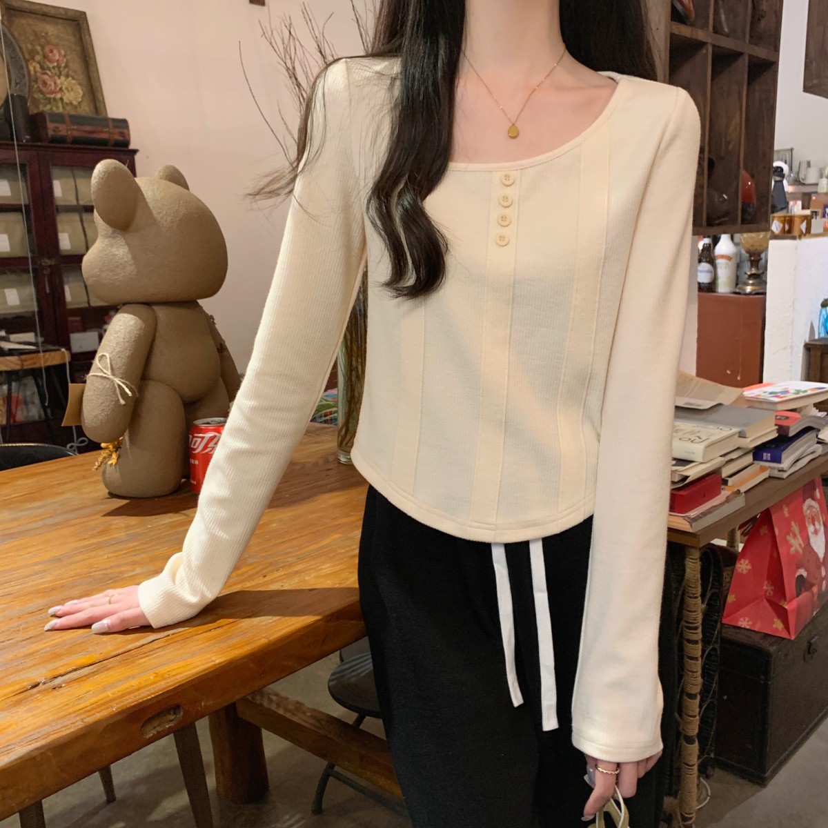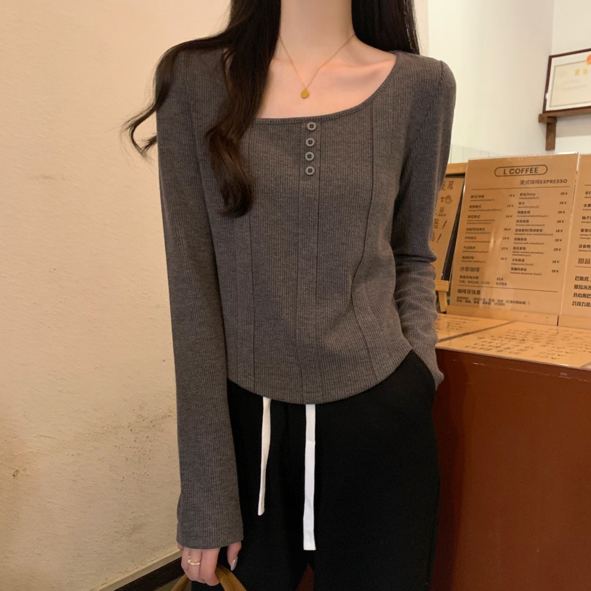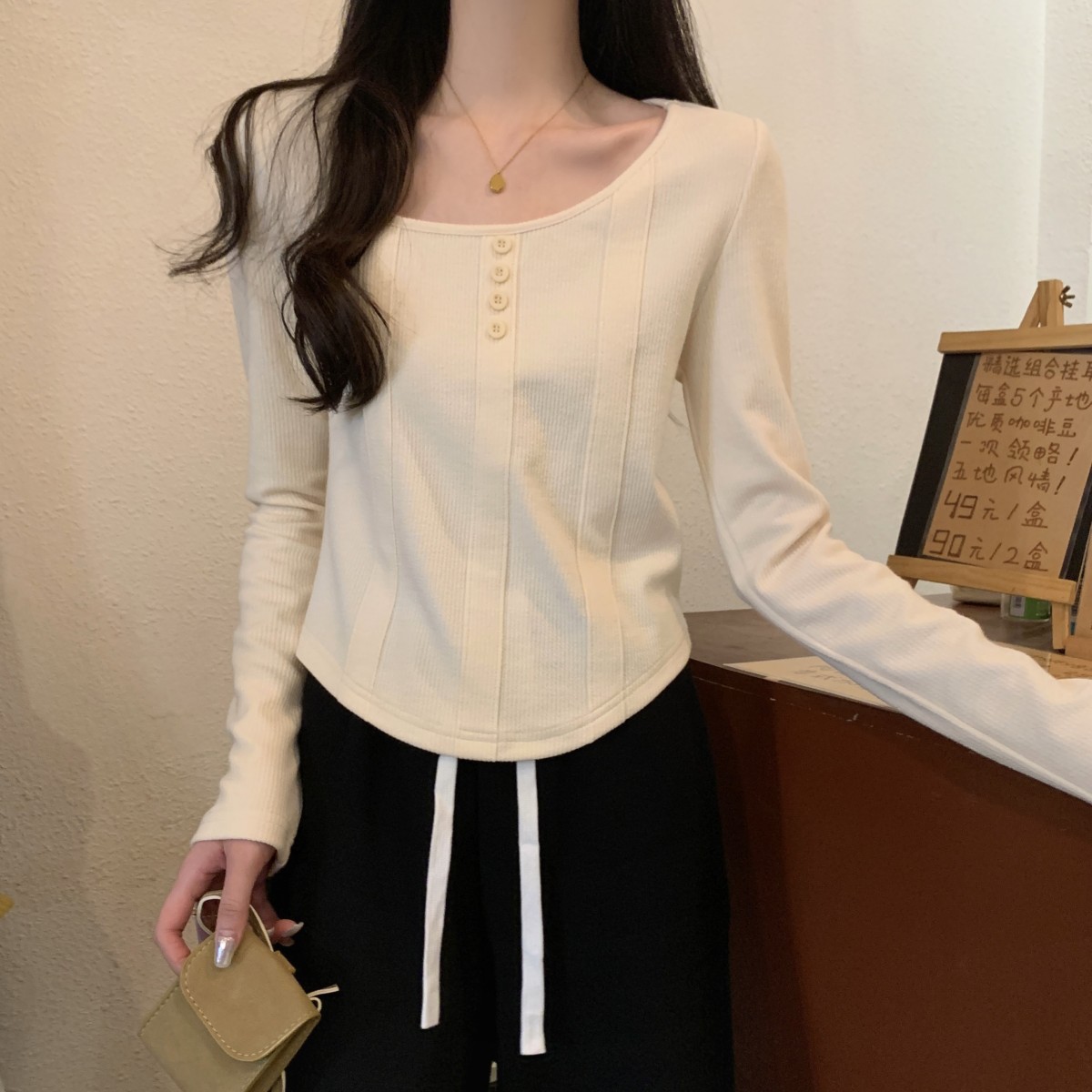 가을 스타일의 실제 한국어 버전, 새로운 정사각형 목 물고기 뼈 버튼 슬림하고 긴 소매 티셔츠 탑 내부의 슬림