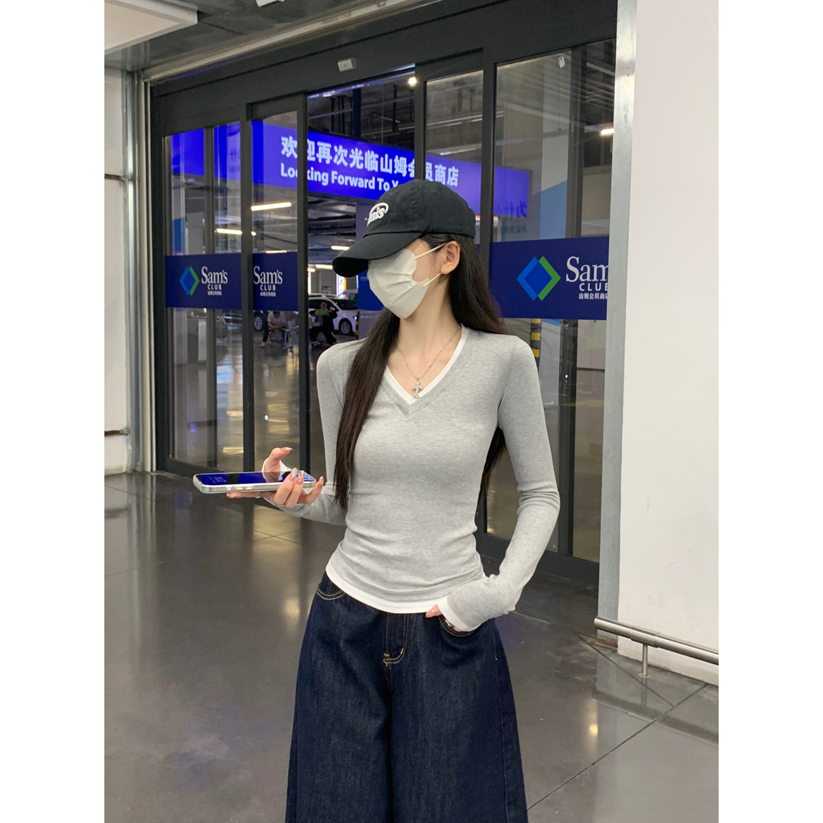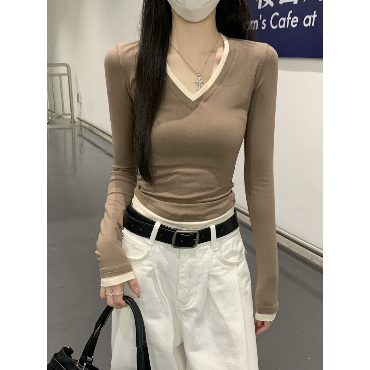 실제 사진과 실제 가격. 이른 가을 한국 버전의 한국 버전에는 대조적 인 컬러 v- 넥 슬림 기질과 다목적 모달베이스 셔츠와 긴 소매 티셔츠가 있습니다.