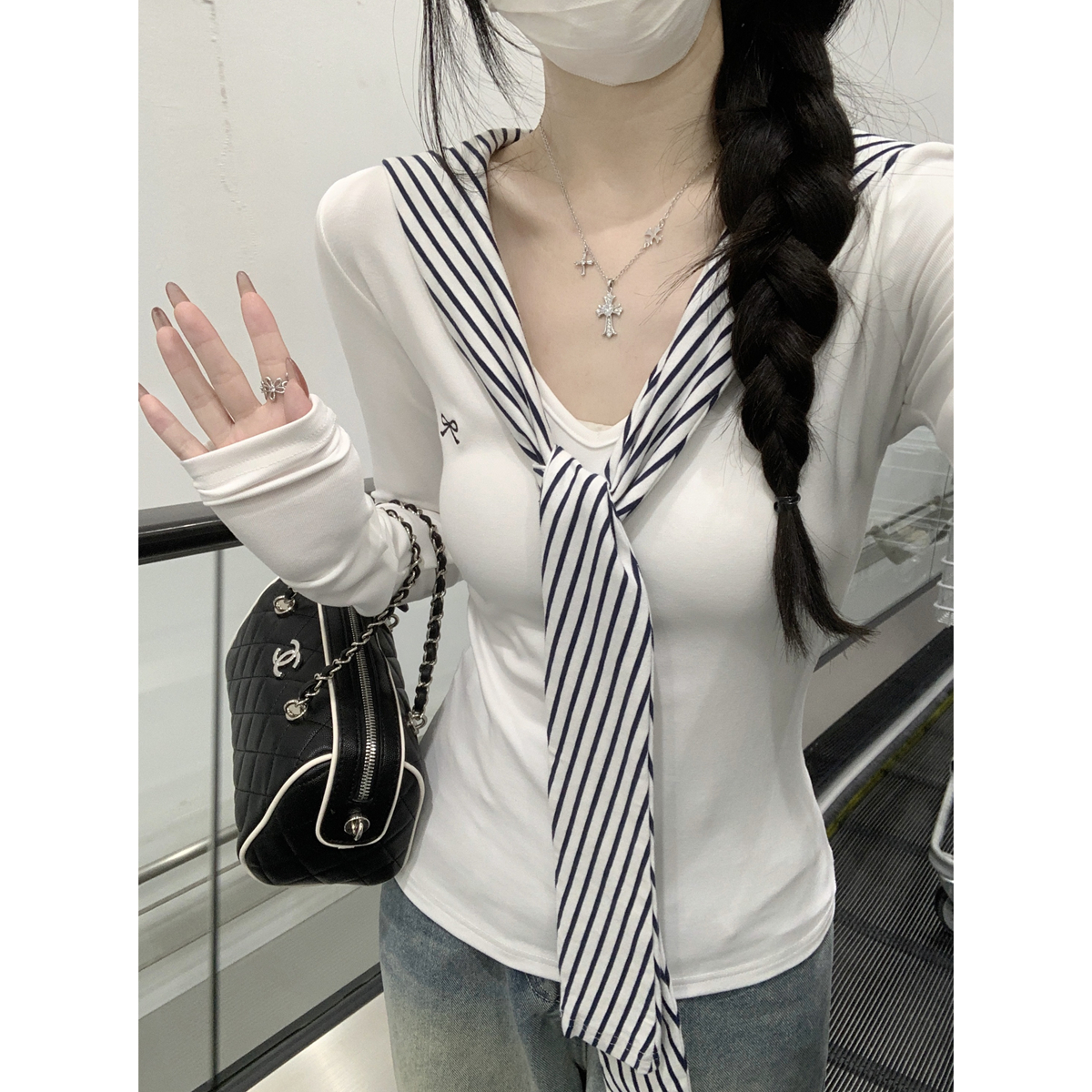 실제 사진과 실제 가을 가을 한국어 버전 보우 자수 디자인 스트라이프 숄 스트랩 슬림 긴 슬리프 티셔츠 탑
