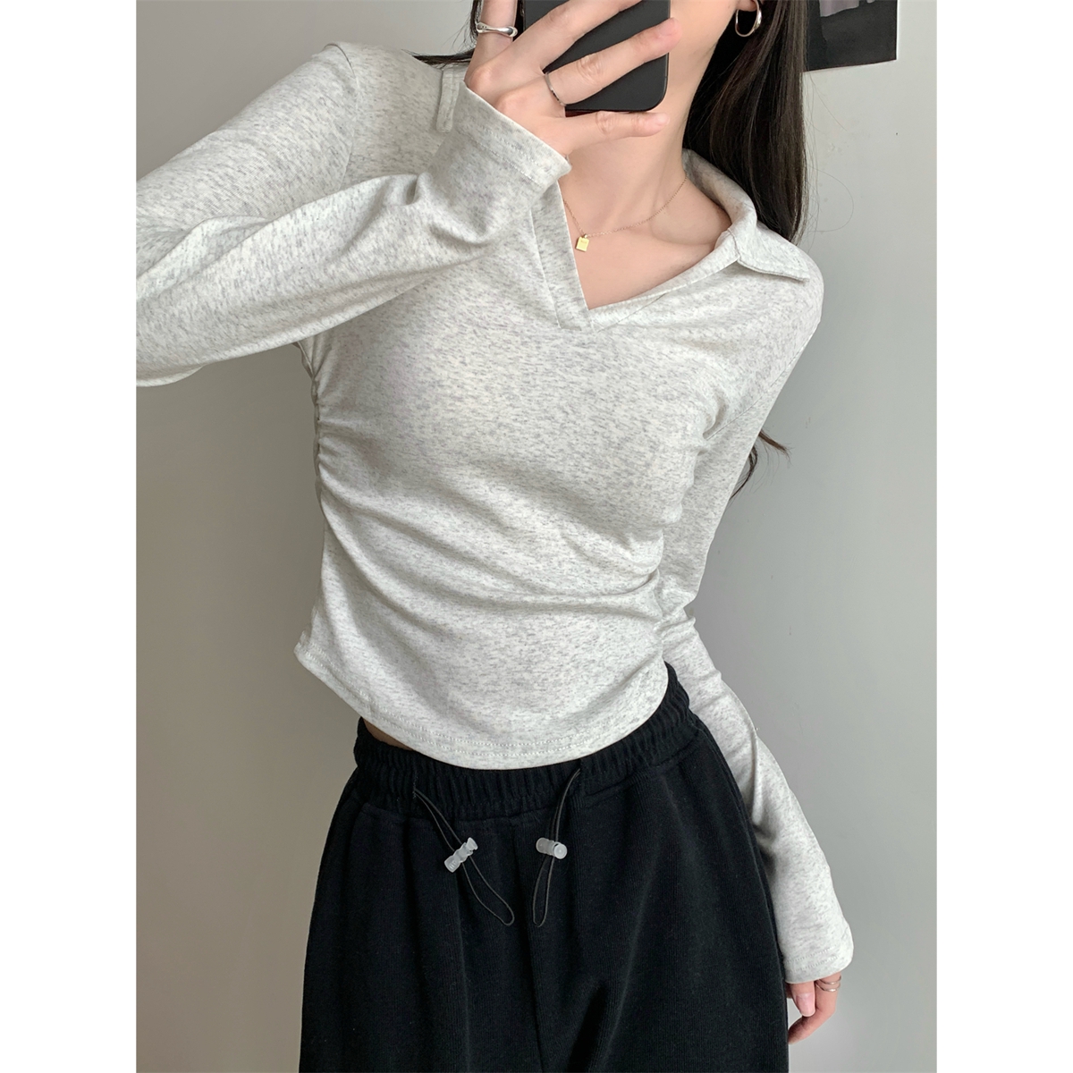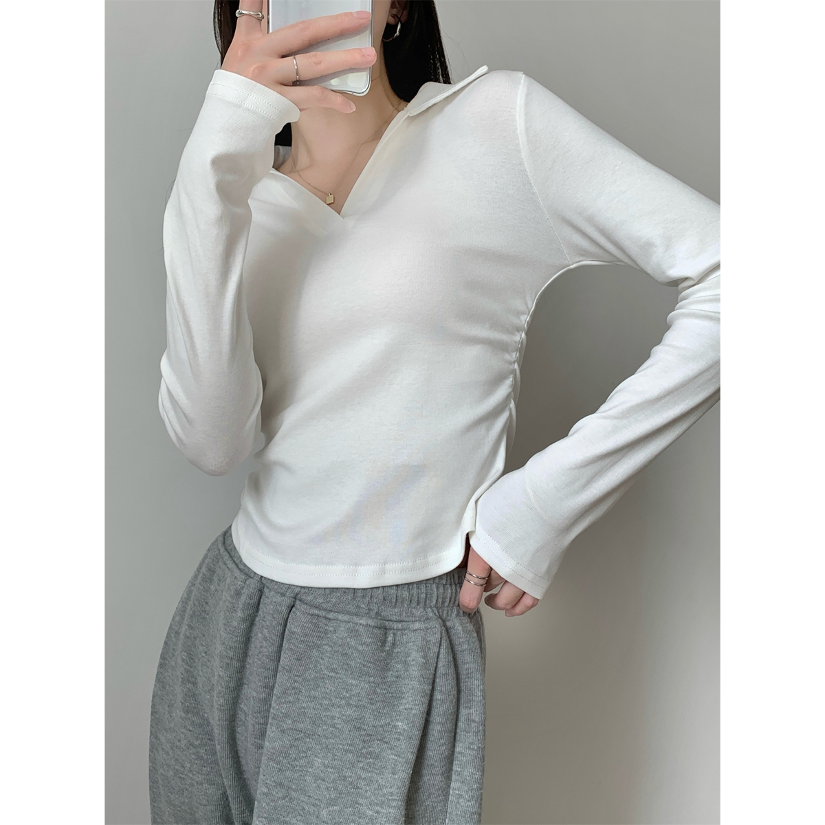 실제 사진과 실제 가을 가을 한국어 폴로 칼라 순수면 숄더 슬림 한 긴 소매 티셔츠베이스 셔츠 탑