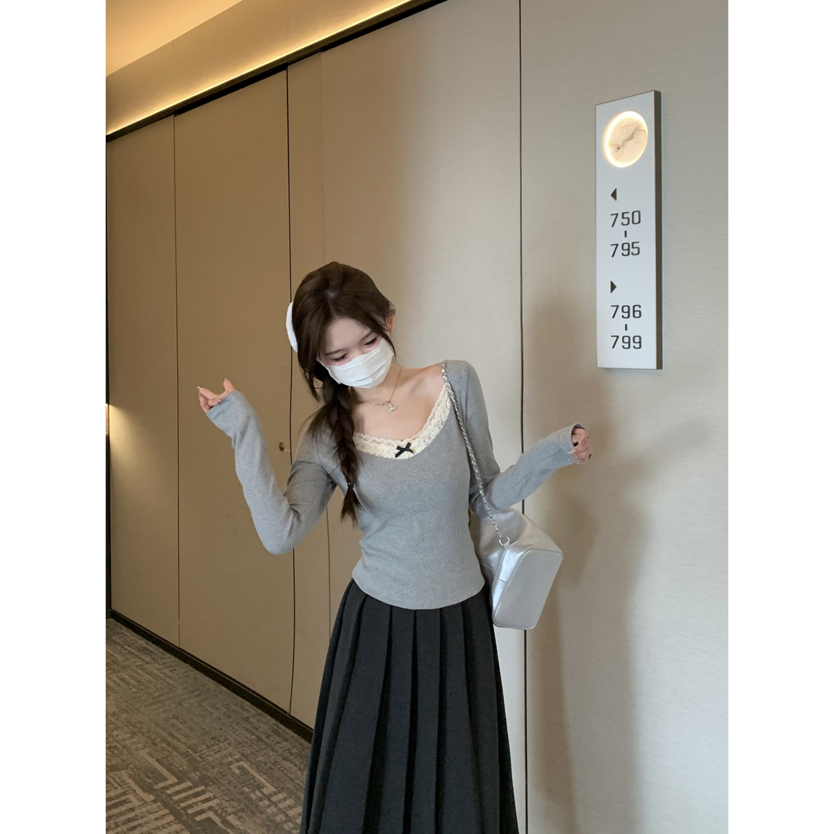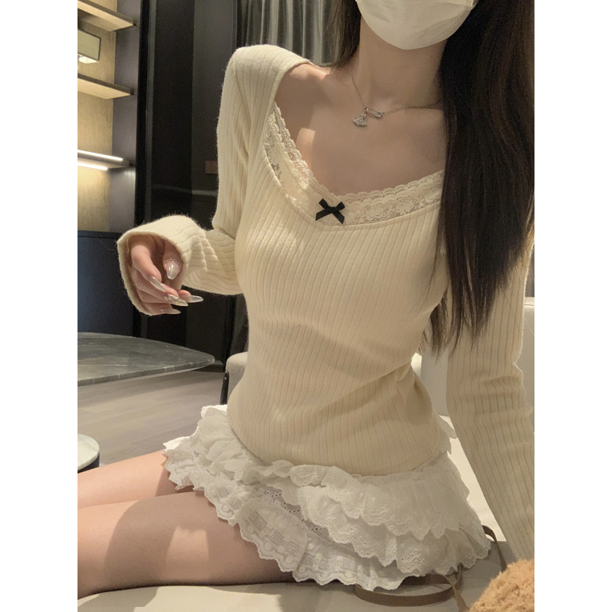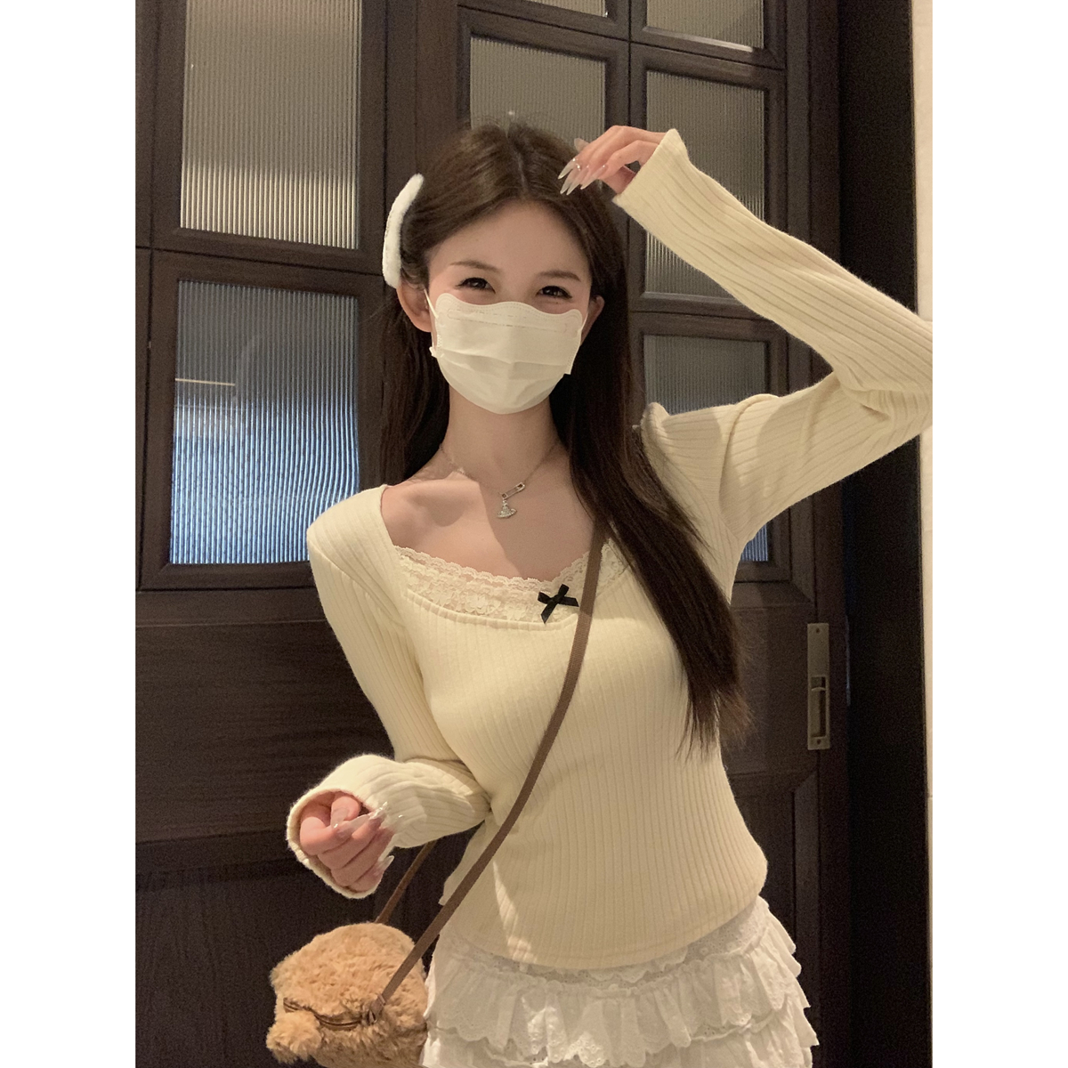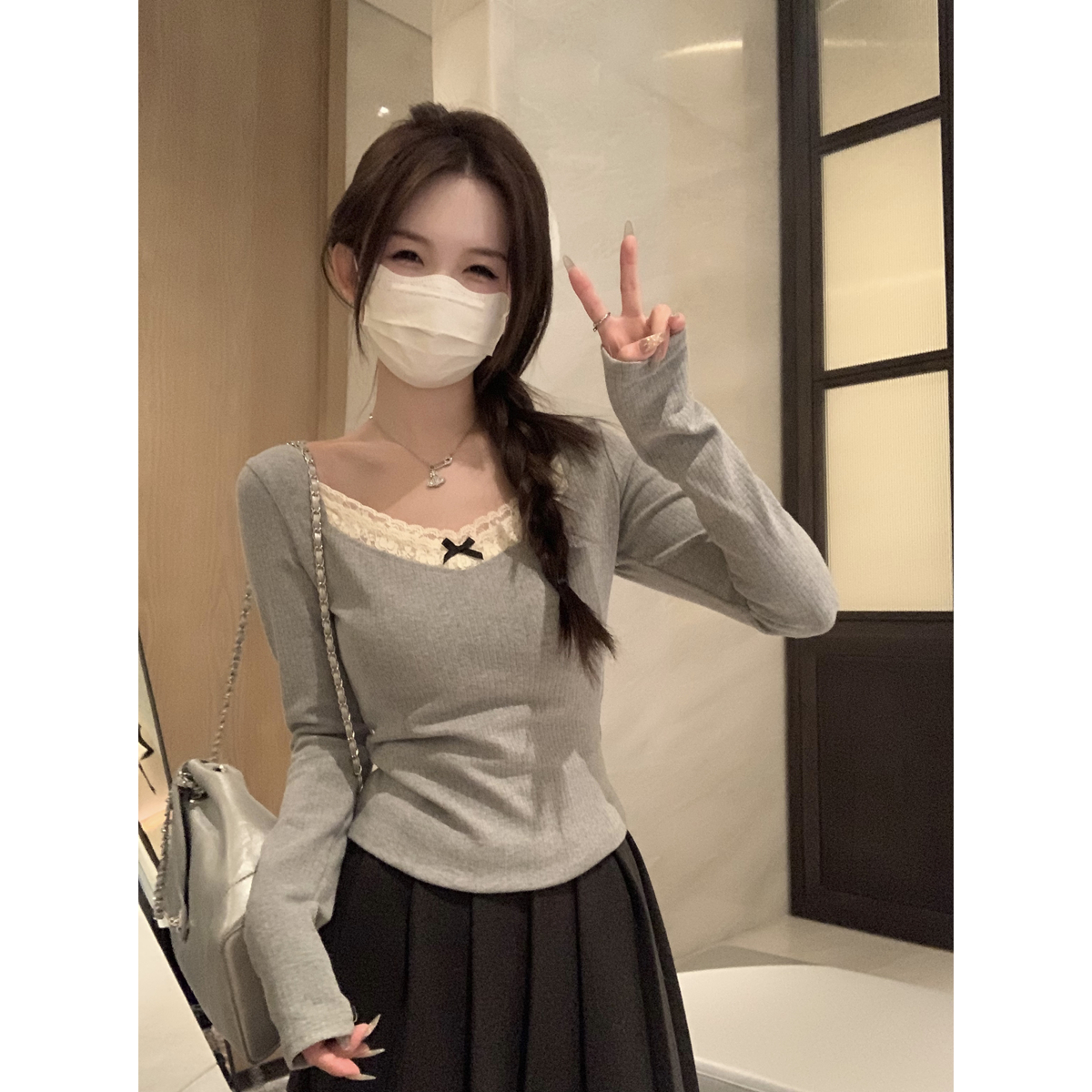 실제 사진과 실제 가격. 이른 가을 한국 버전의 순수 레이스 스 플라이 싱 스퀘어 칼라 슬림 긴팔베이스 셔츠 티셔츠 속옷