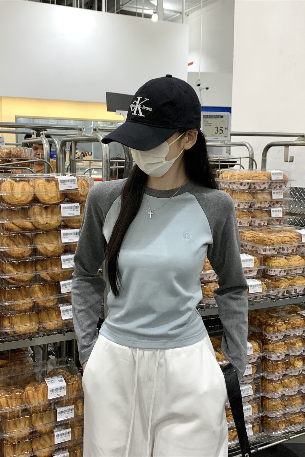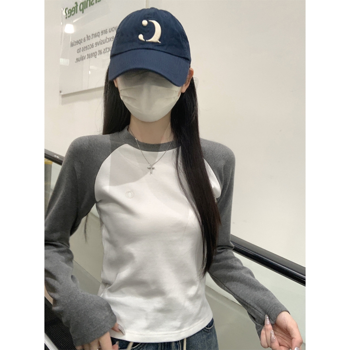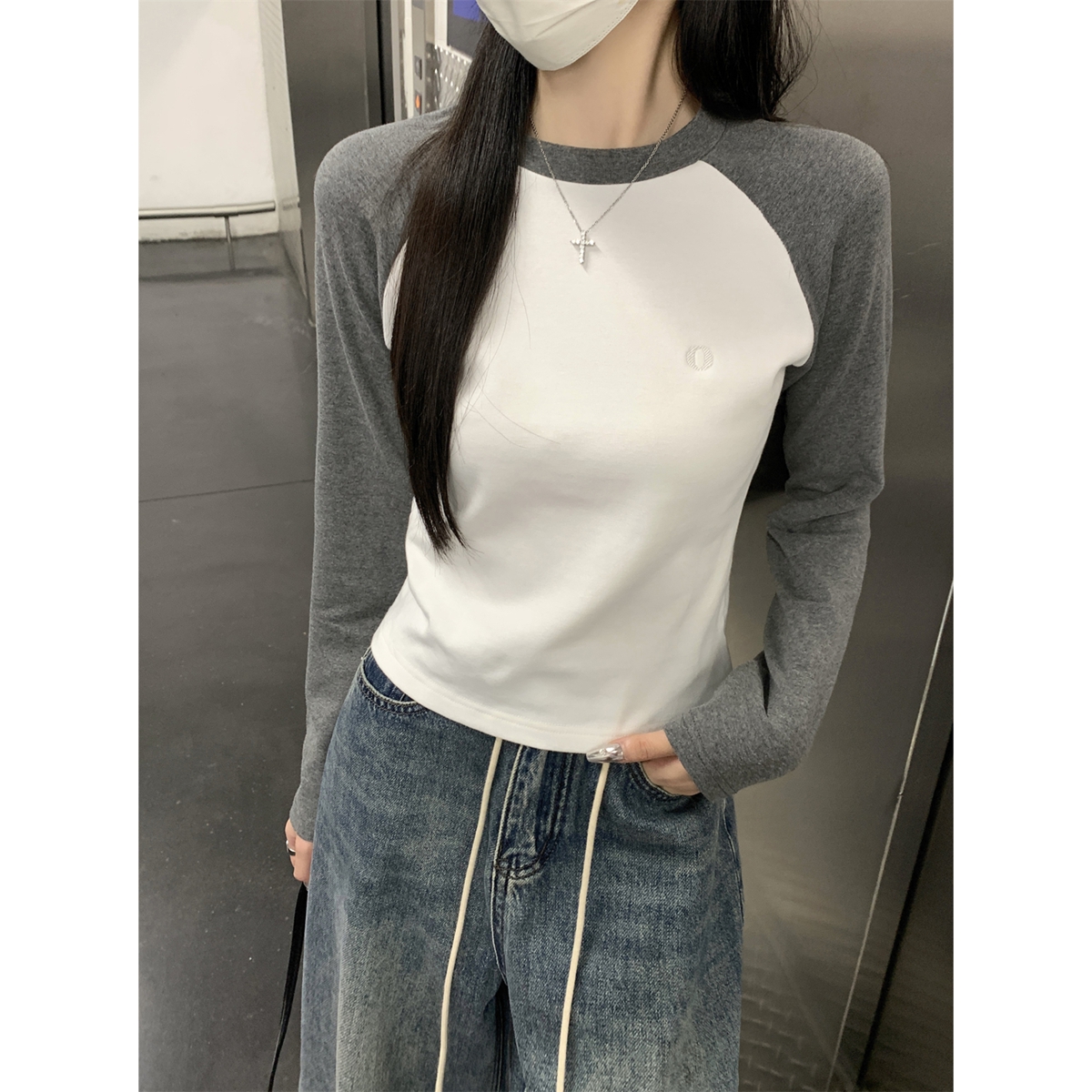 실제 사진과 실제 가격. 이른 가을 한국 버전 대조 컬러 라운드 넥 슬림 한 핏 슬림 걸레 숄더 편지 자수 긴 슬리브 티셔츠 탑