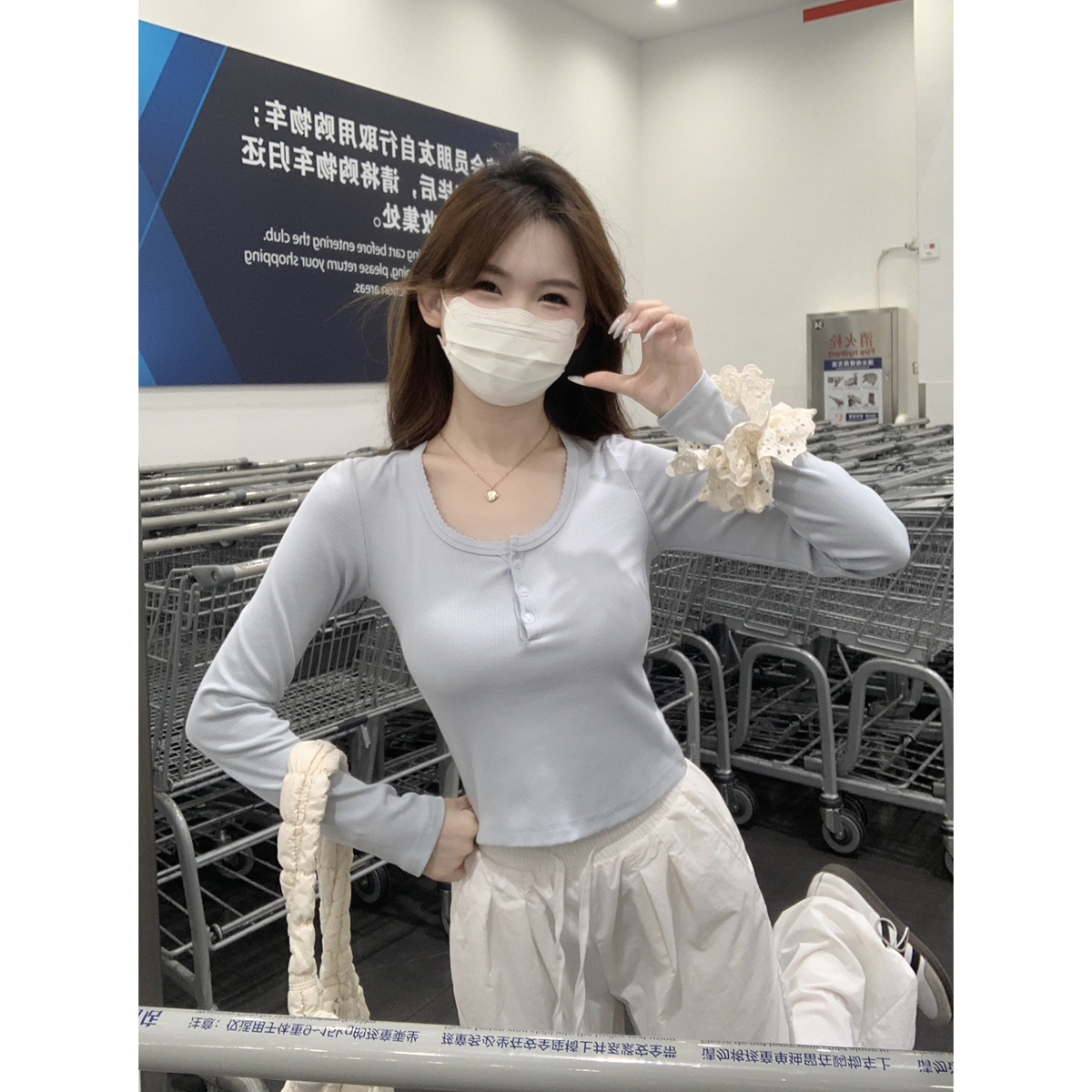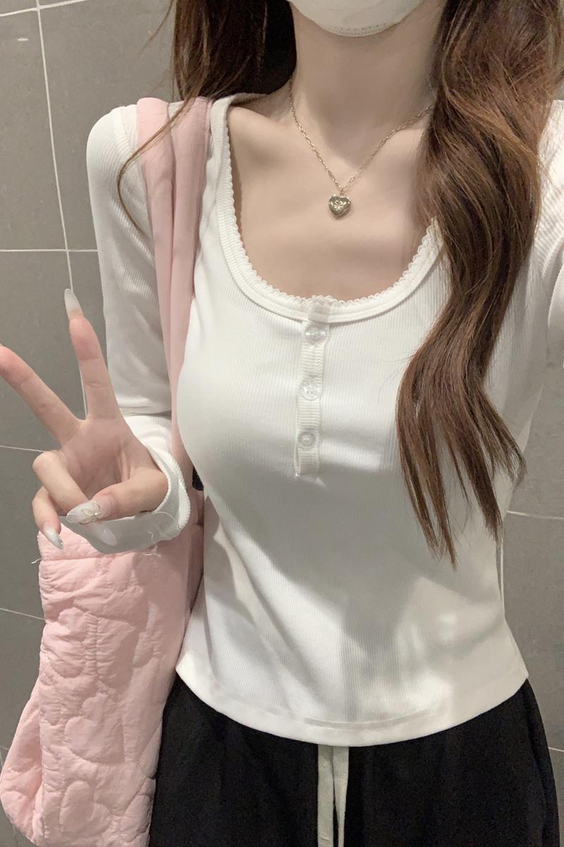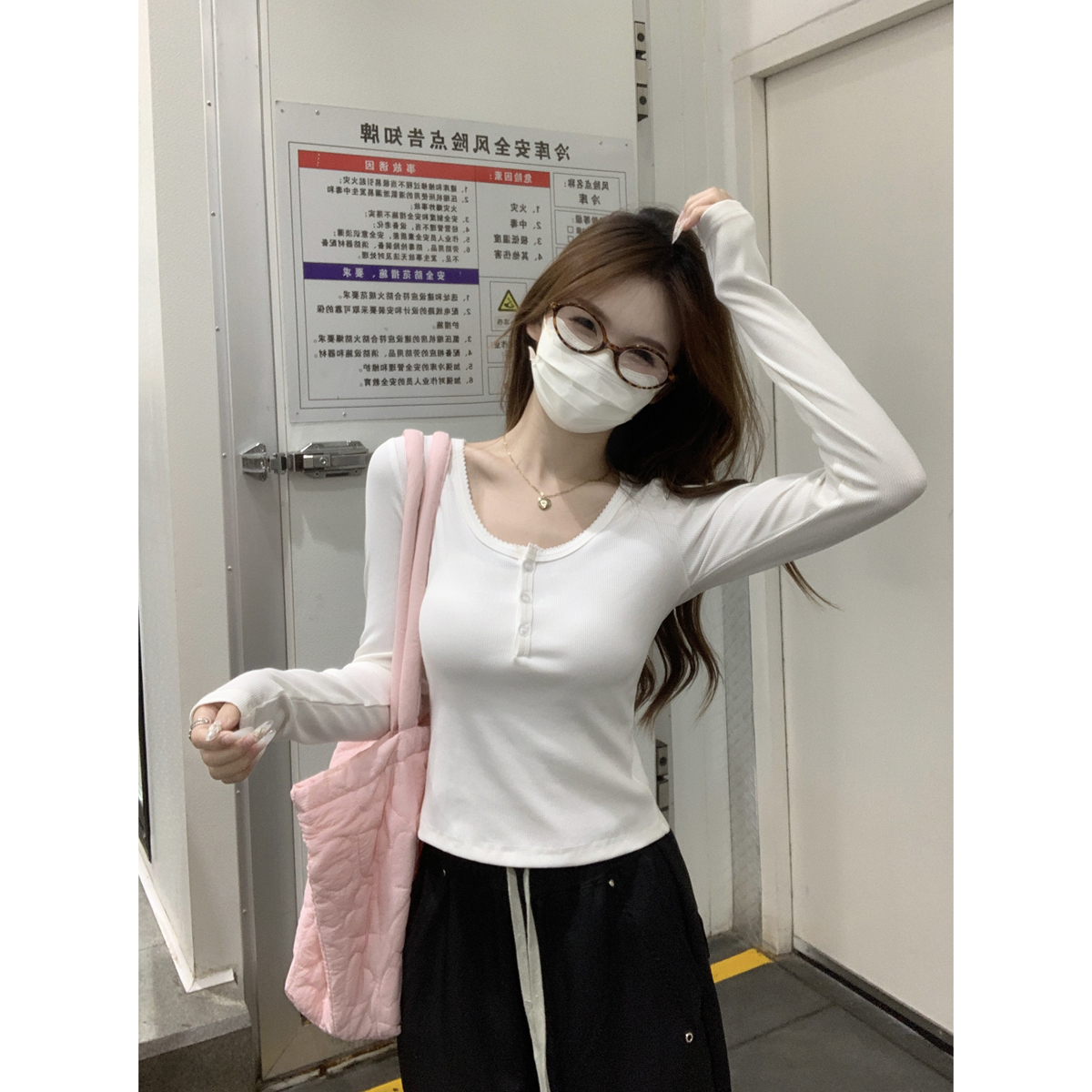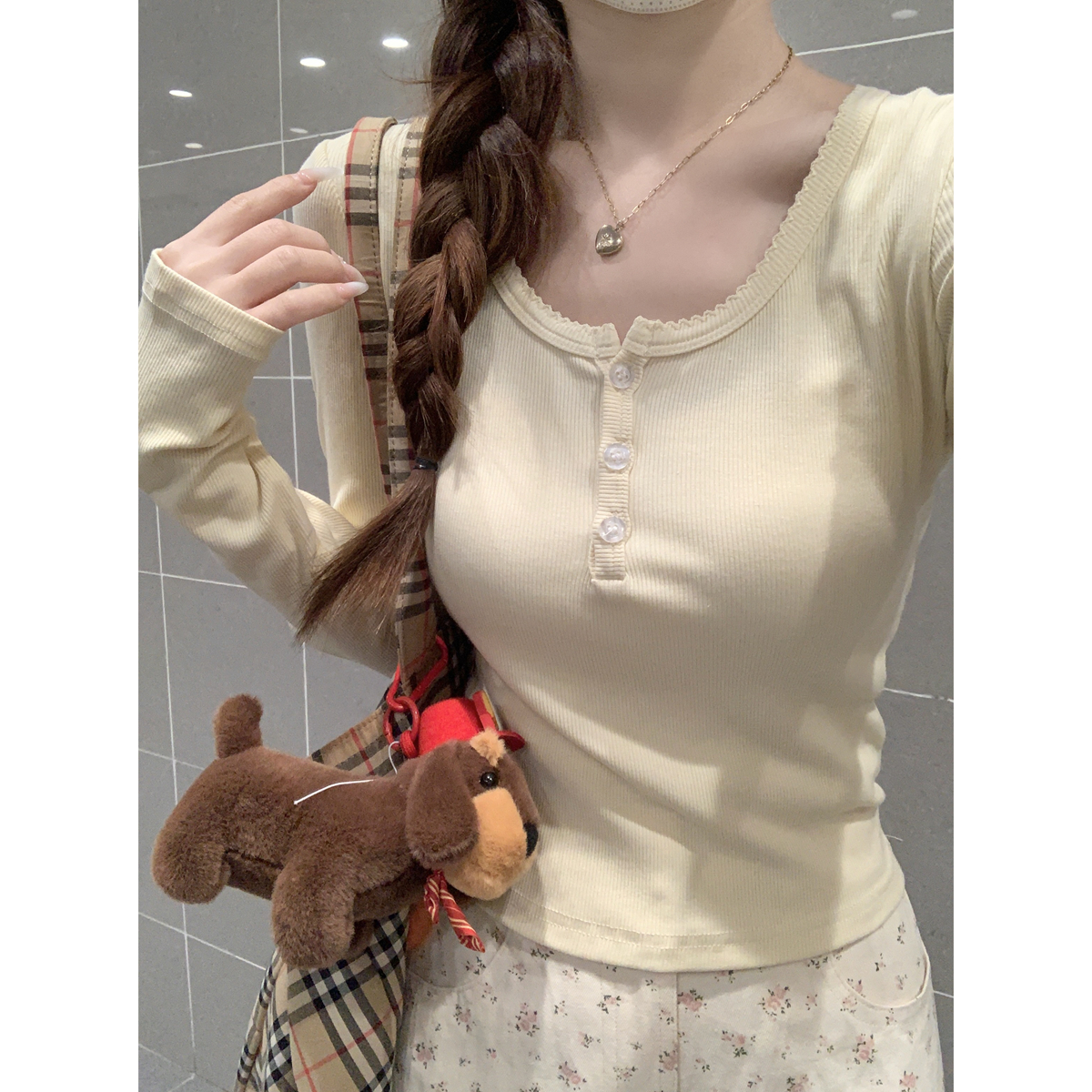 실제 샷과 실제 가격. 가을 스타일 스퀘어 칼라 버튼의 새로운 한국 스타일 슬림 어깨 롱 슬리브 여성용 티셔츠 탑