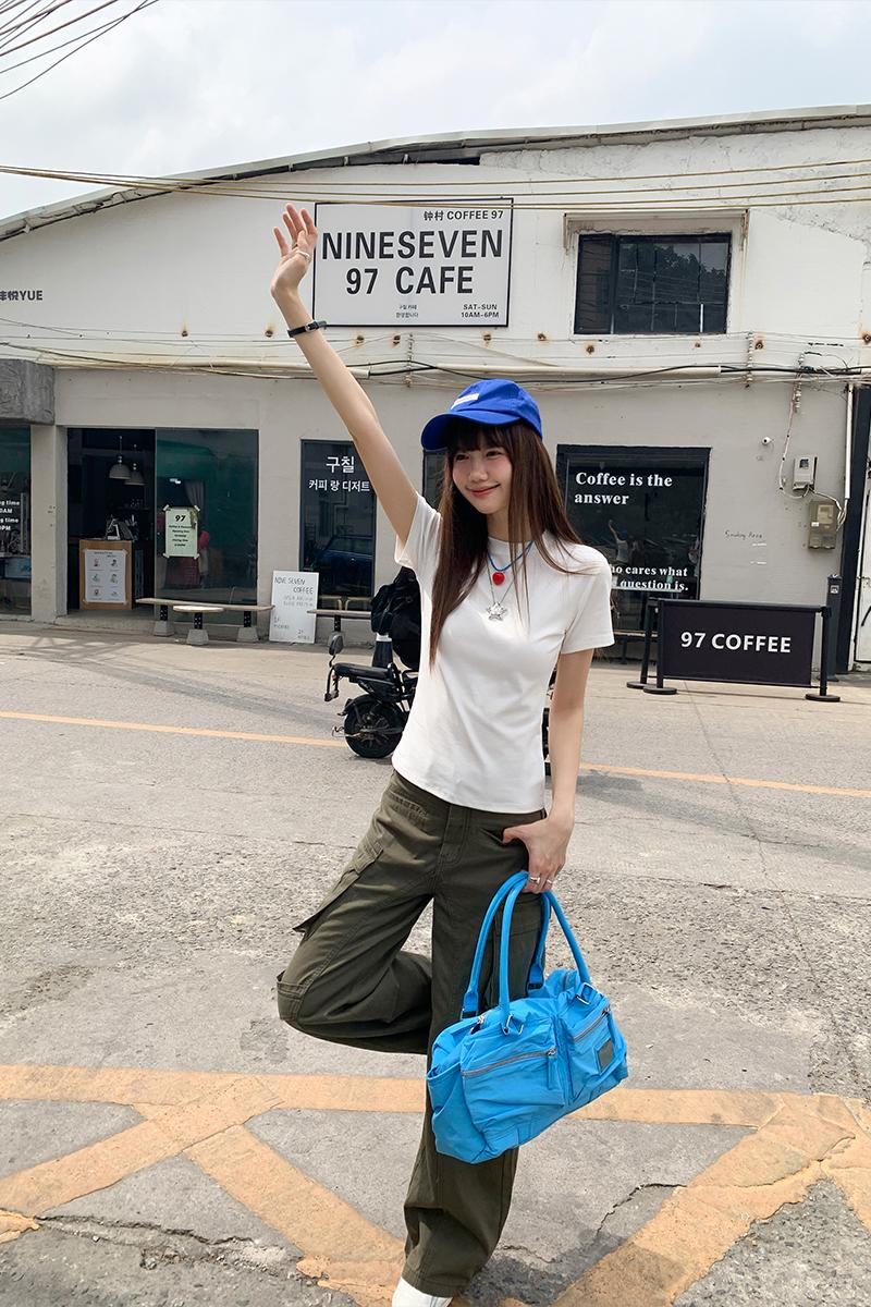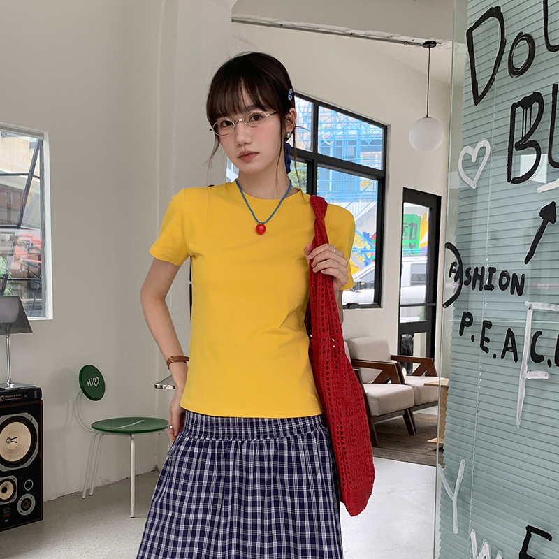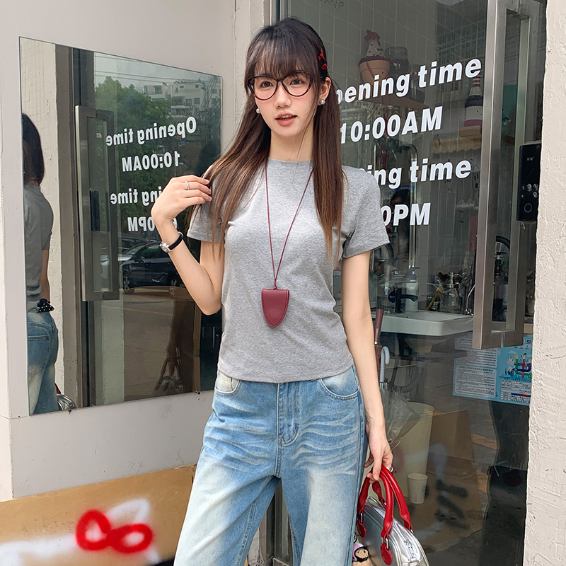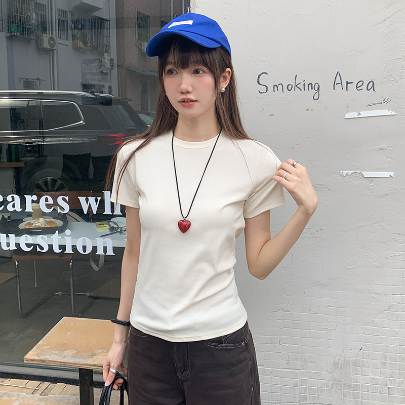 실제 촬영, 실제 가격 전면 어깨 어깨 단락 티셔츠 여름에 여성을위한 여성용 2025 년 새로운 슬림 다목적 탑 단색베이스 셔츠