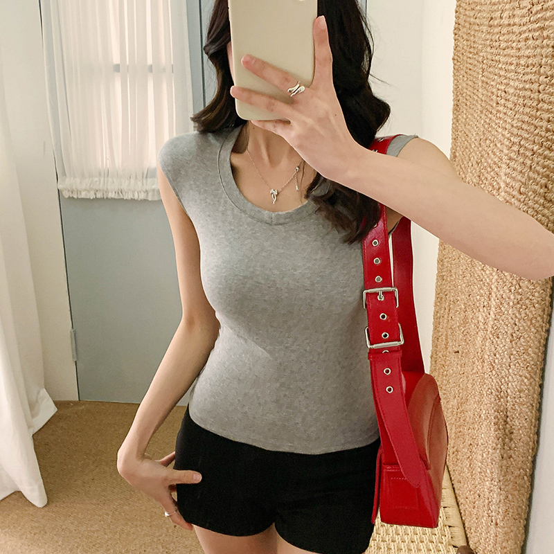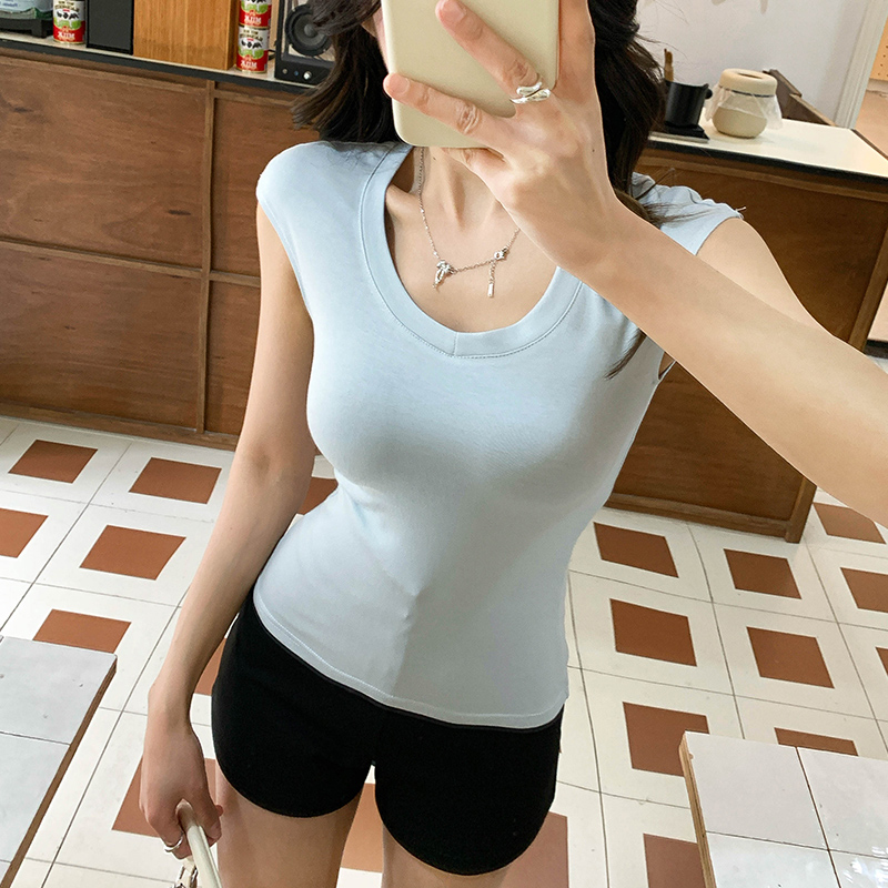 여성의 여름을위한 실제 단순한 U-Neck 짧은 슬리브 티셔츠 새로운 다재다능 기본 단색 허리 클로징 탑