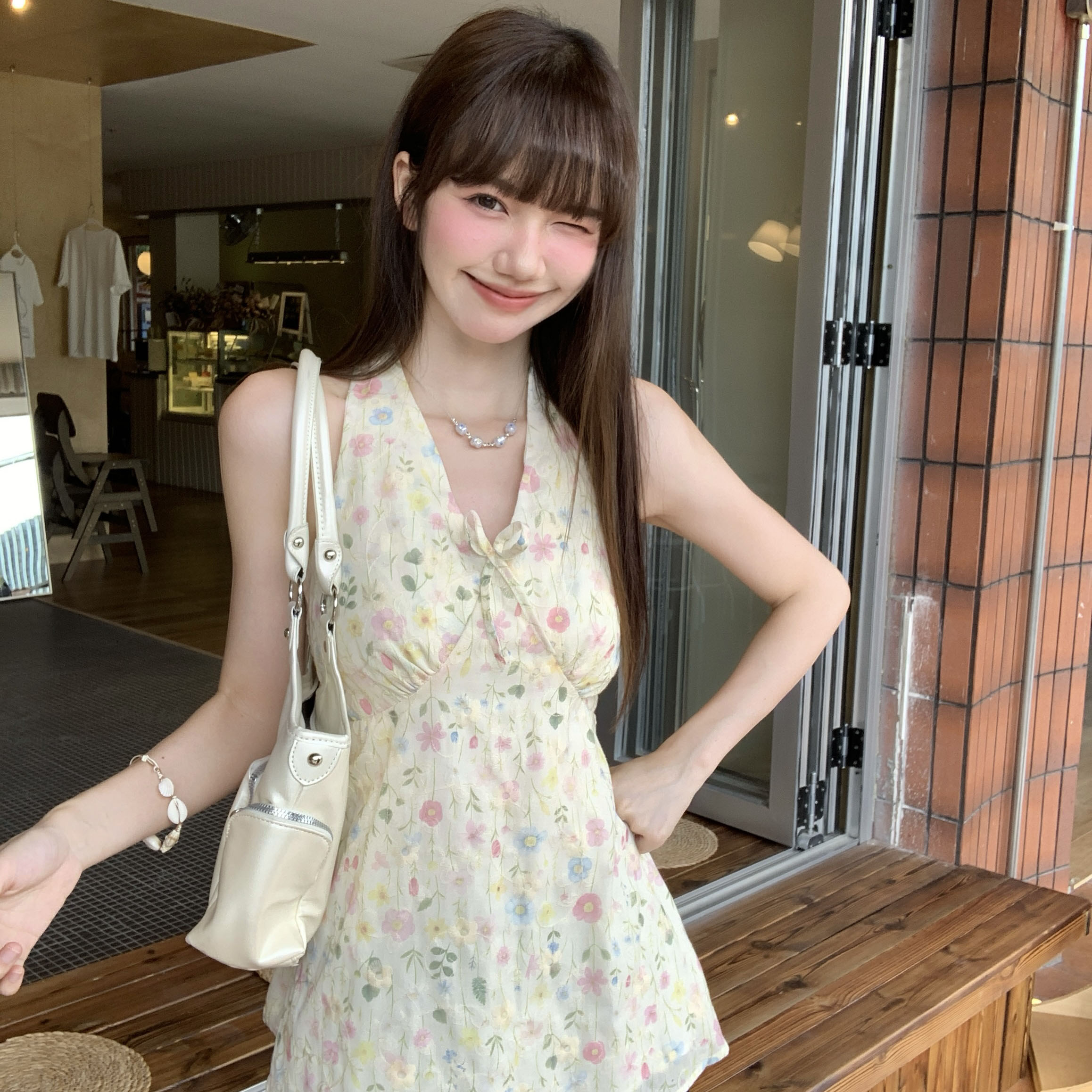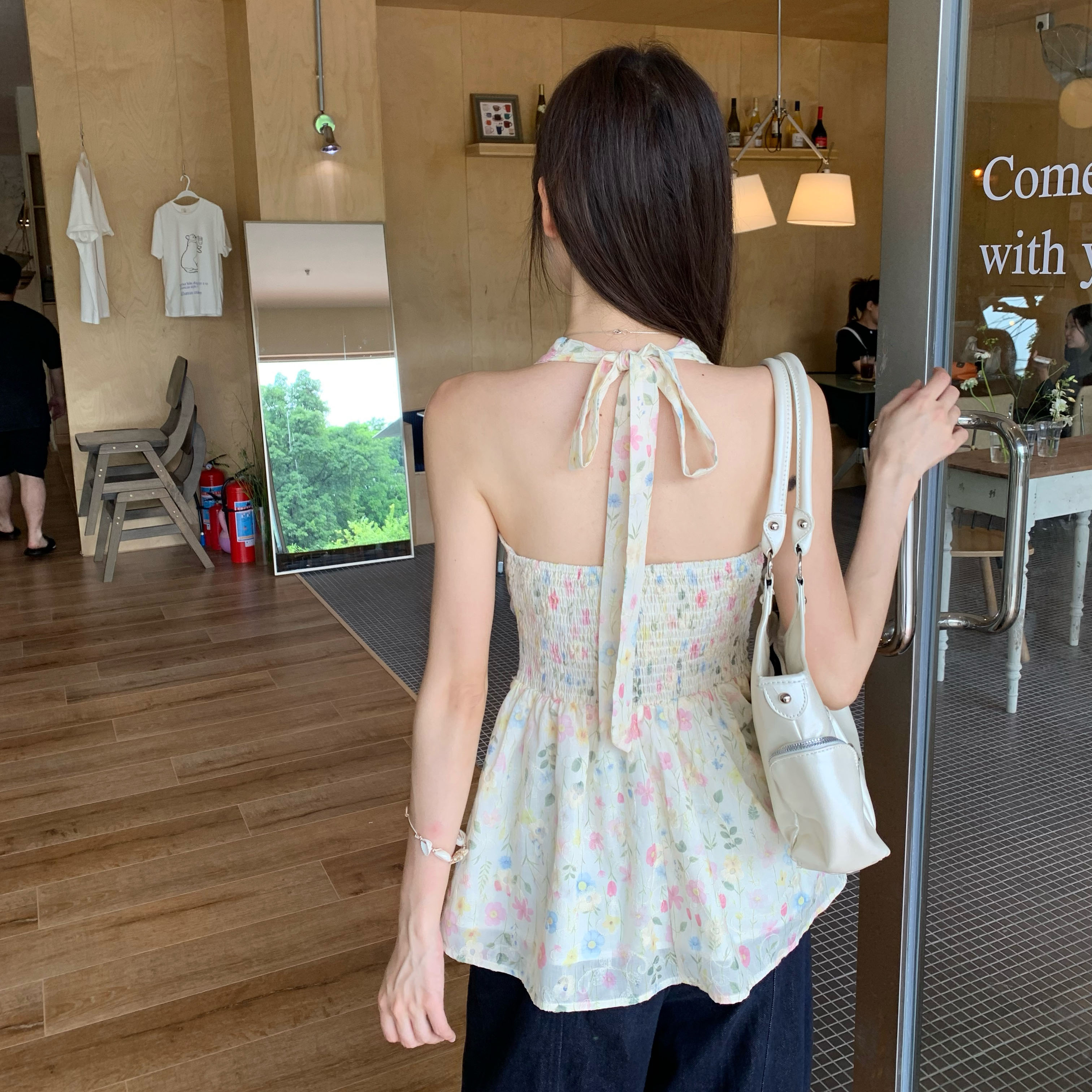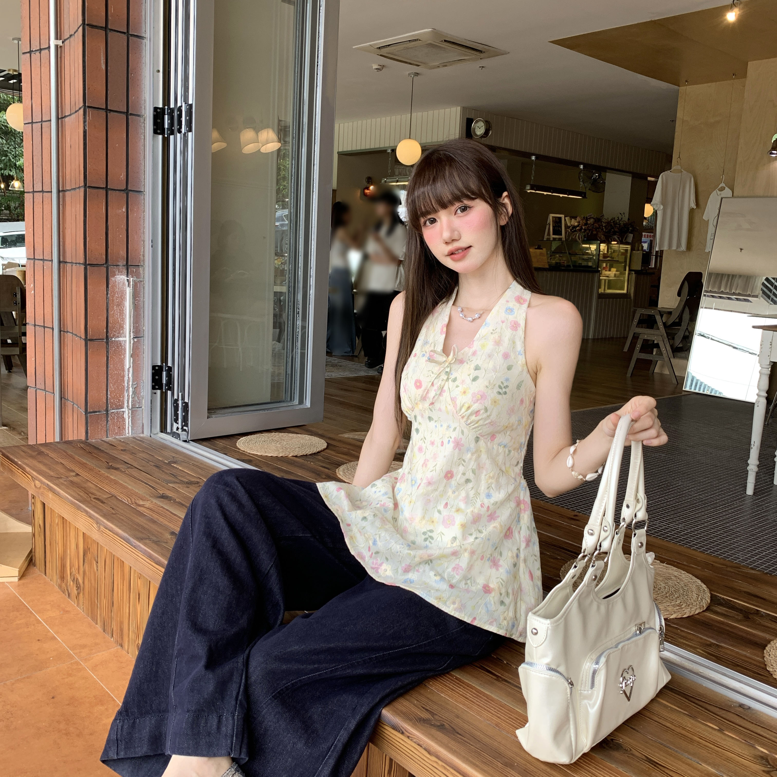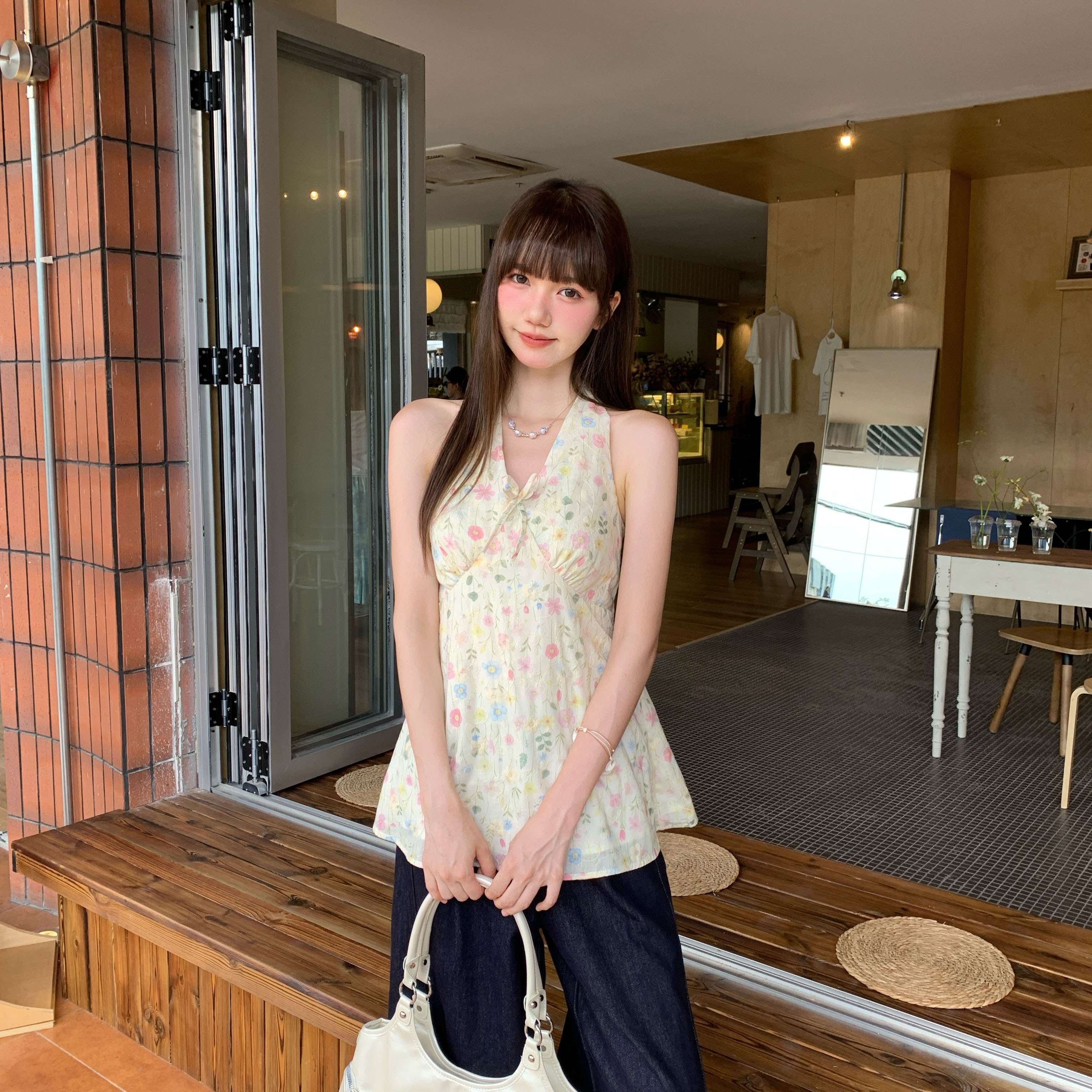 실제 가격# 여성용 레이스 업 홀터 넥 조끼 2025 여름 새로운 프랑스 레트로 플로럴 슬림 핏과 슬림