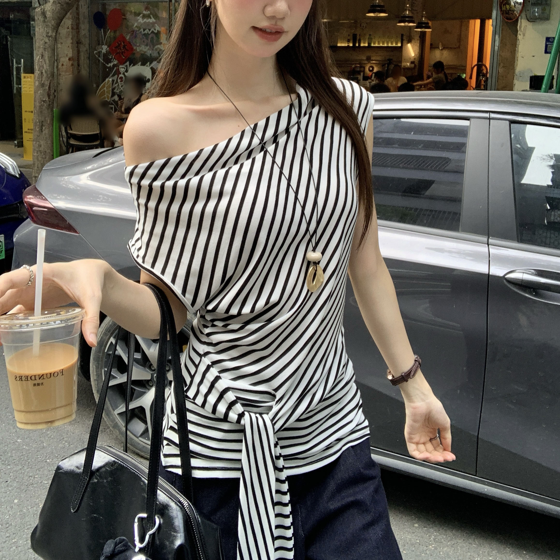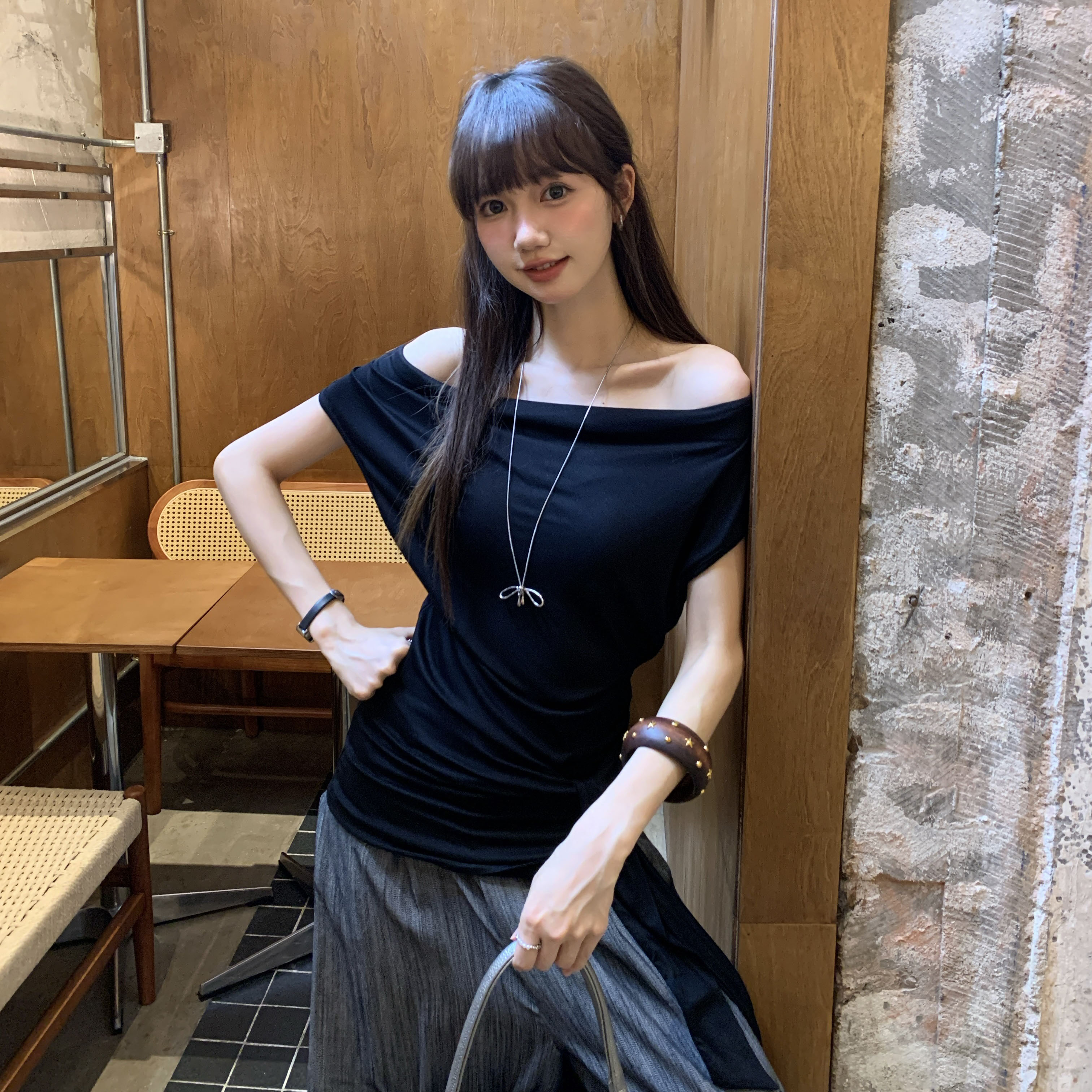 실제 샷 및 실제 가격#단색 스윙 목이 여성을위한 짧은 슬림 티셔츠 2025 여름 새 슬림 착용과 순수하고 정욕적인 뜨거운 여자 허리