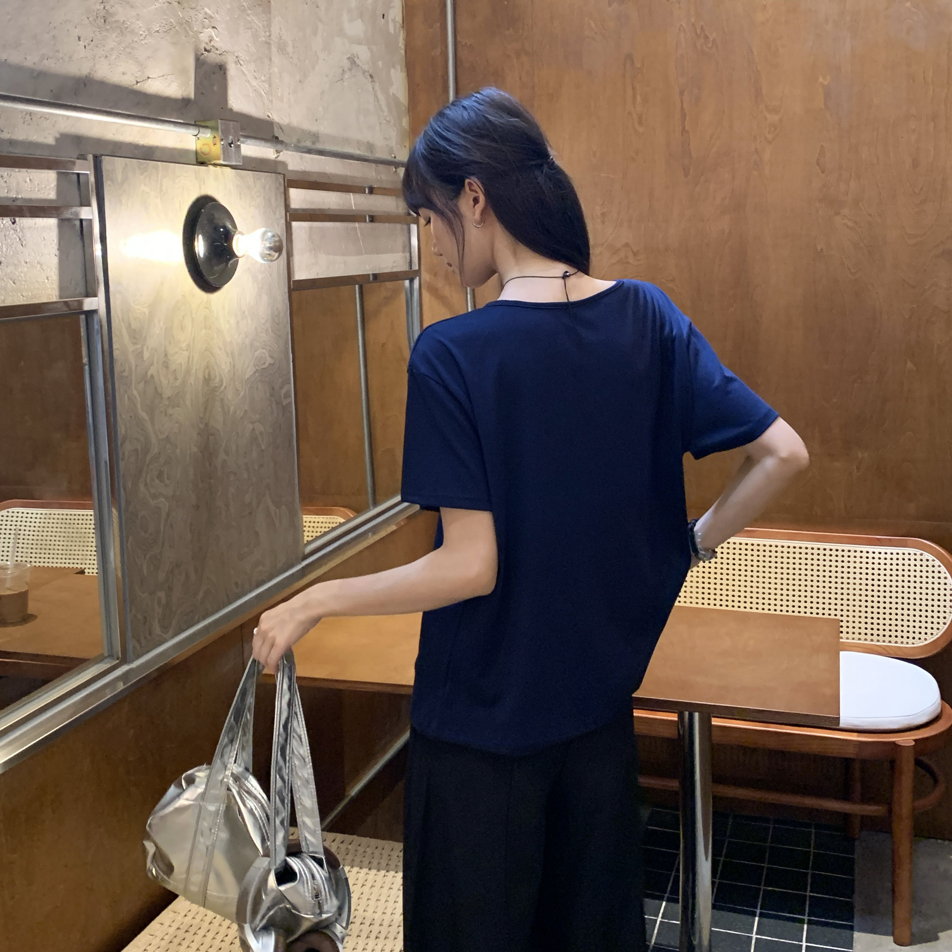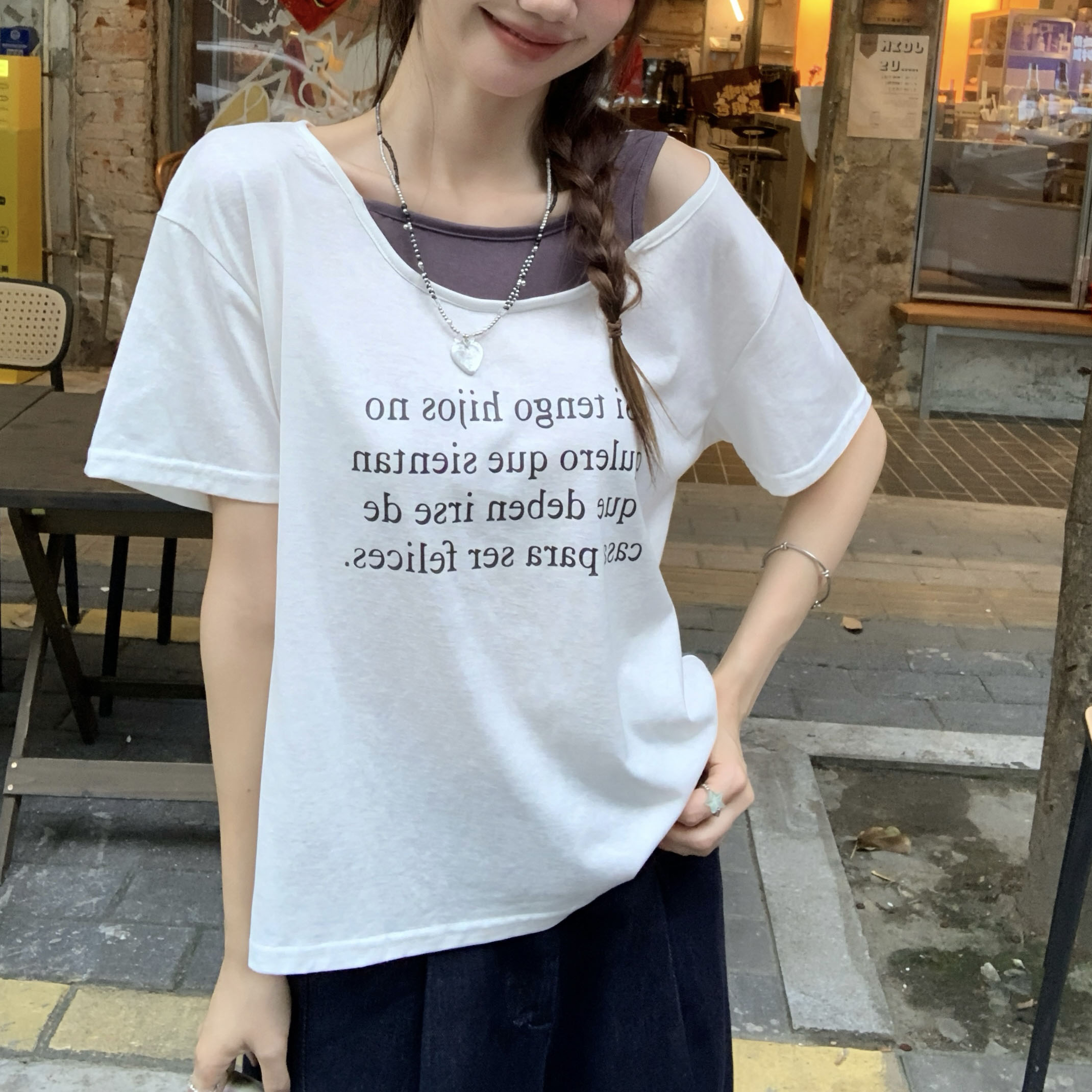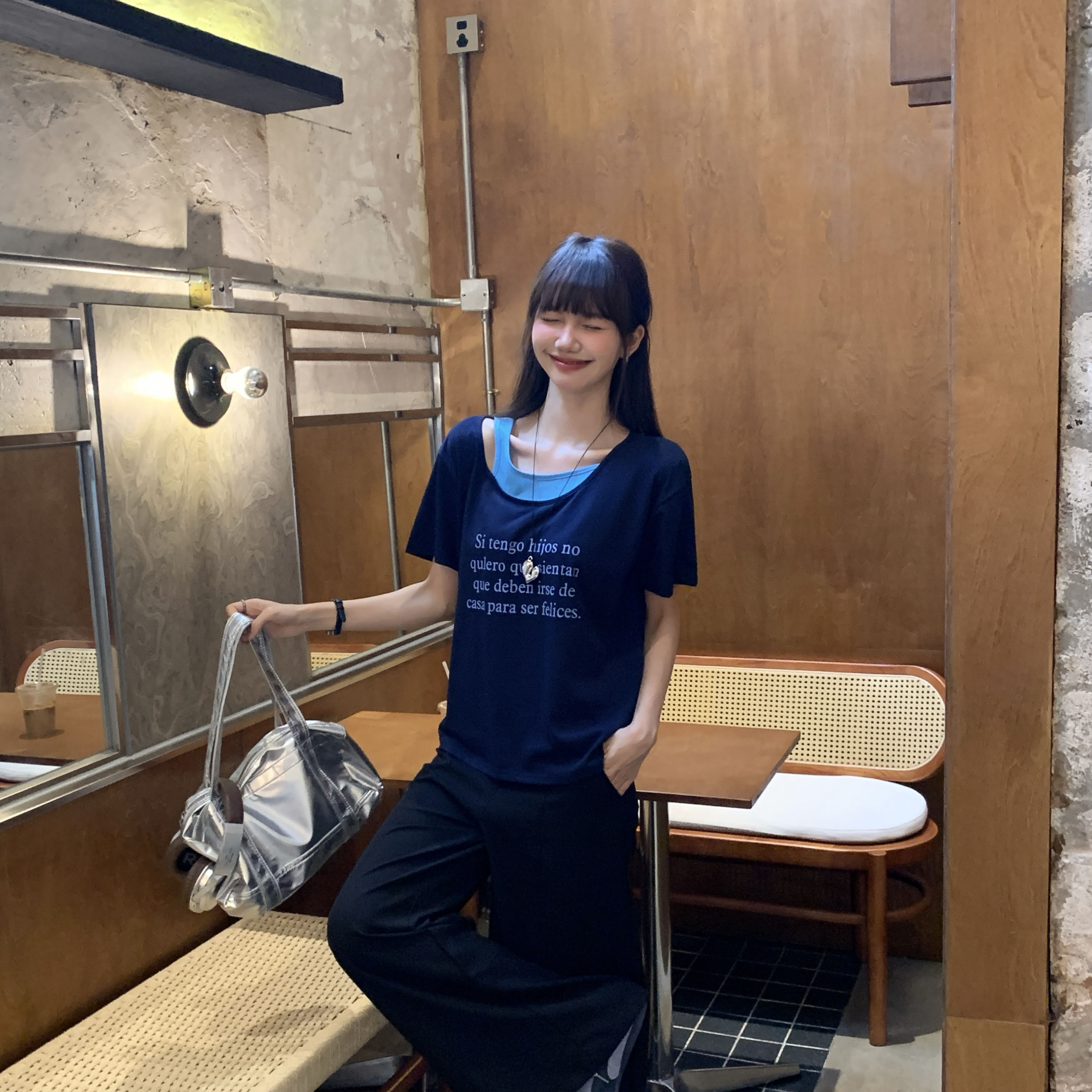 실제 샷 및 실제 가격 #Navy Blue Letter 인쇄 가짜 2 피스 2 피스 짧은 슬리브 티셔츠 여름에 여성을위한 2025 년 새로운 스타일을 날씬하고 느슨하게 보이게합니다.