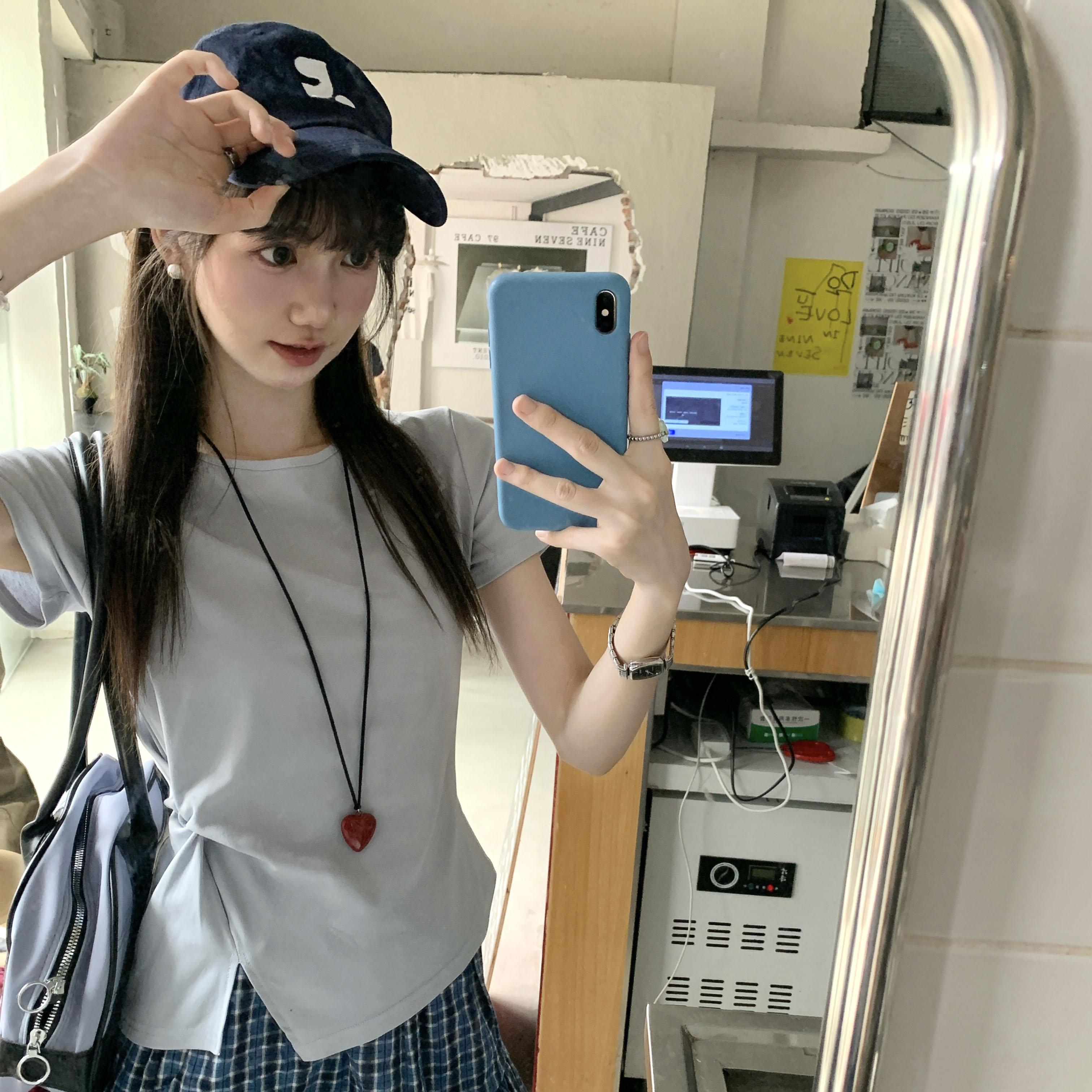 실제 샷 및 실제 가격 #Bean Green 불규칙한 꼬임 직선 어깨 어깨 단축 티셔츠 여름 캐주얼 및 다재다능한 슬림 한 짧은 스타일
