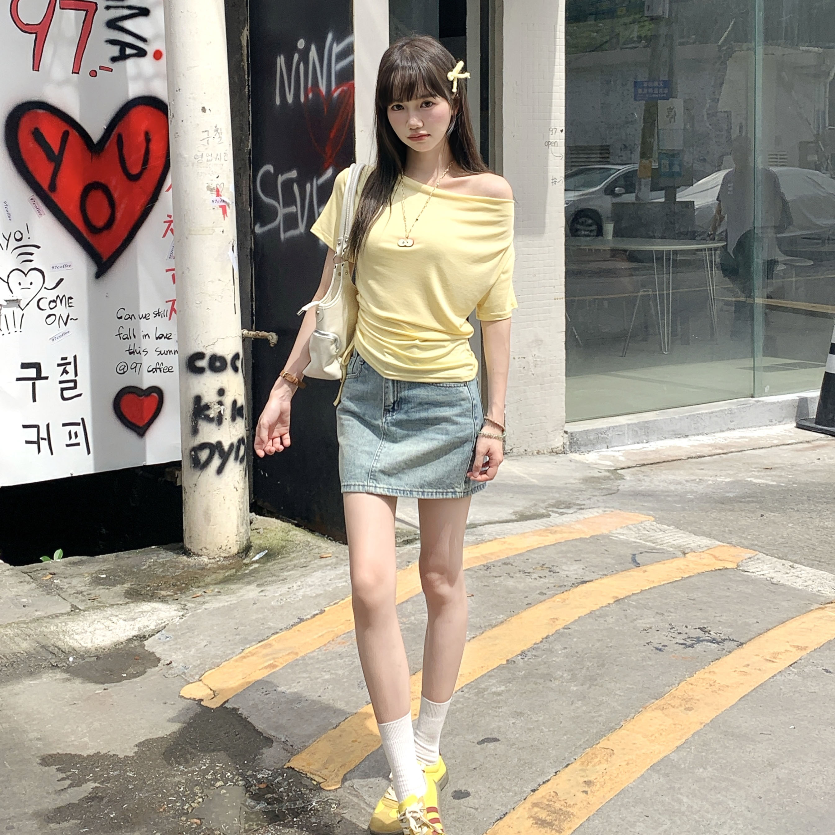 실제 가격#옐로우 스윙 칼라 스트레이트 어깨 어깨 단락 티셔츠 여름 디자인 슬림 핏 및 슬림 반팔 티셔츠 드로 스트링