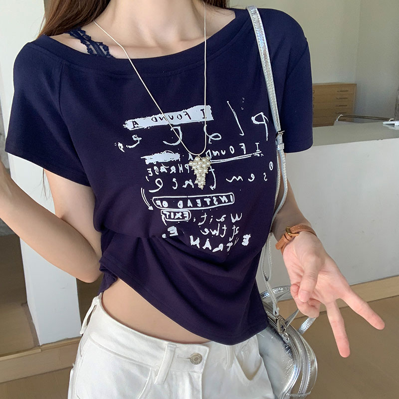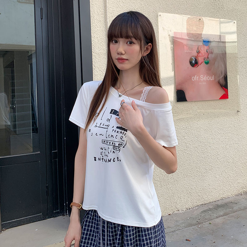 실제 샷 및 실제 가격# 여성용 짧은팔 티셔츠 2025 여름 신규 인쇄 레이스 서스펜더 스 플라이 싱 오프 숄더 탑 트렌디