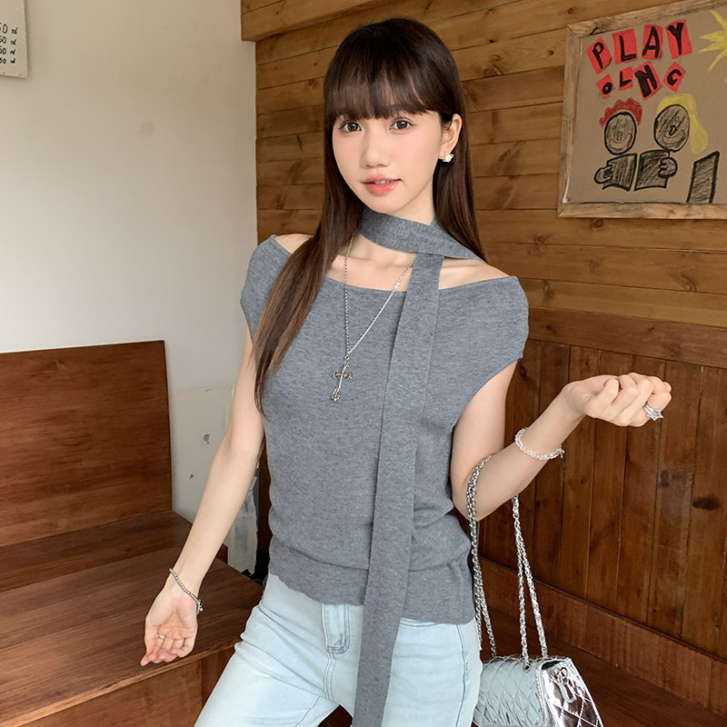 실제 가격#니트 서스펜더 조끼 여성 2025 여름 고급 숄더 슬림 목 소매 소매점 탑