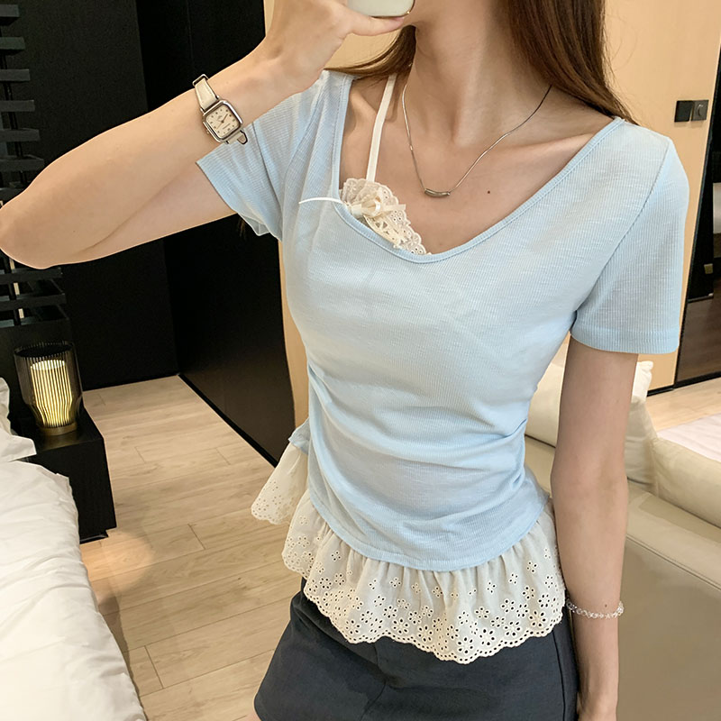 실제 가격 원형 목 순수 욕망 레이스 2025 년 여성을위한 짧은 슬리브 티셔츠 여름 허리 껴안기 및 슬리밍 바디