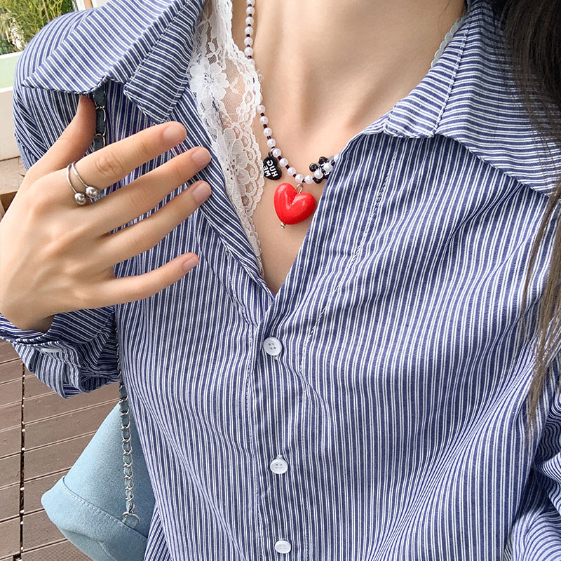 여성을위한 실제 가격 파란색 줄무늬 셔츠 긴팔 여름 2025 새로운 레이스 스 플라이 싱 디자인 긴팔