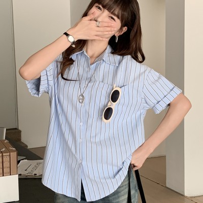 폴로 칼라 블루 스트라이프 반팔 셔츠 여성용 2025 여름 신상