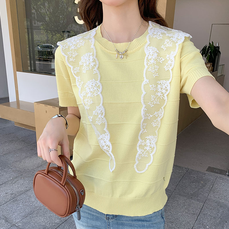 실제 샷 및 실제 가격# 둥근 목에 스 플린 스 플라이 싱 레이스 ​​짧은 소매 스웨터 2025 여름 새 한국 셔츠 작은