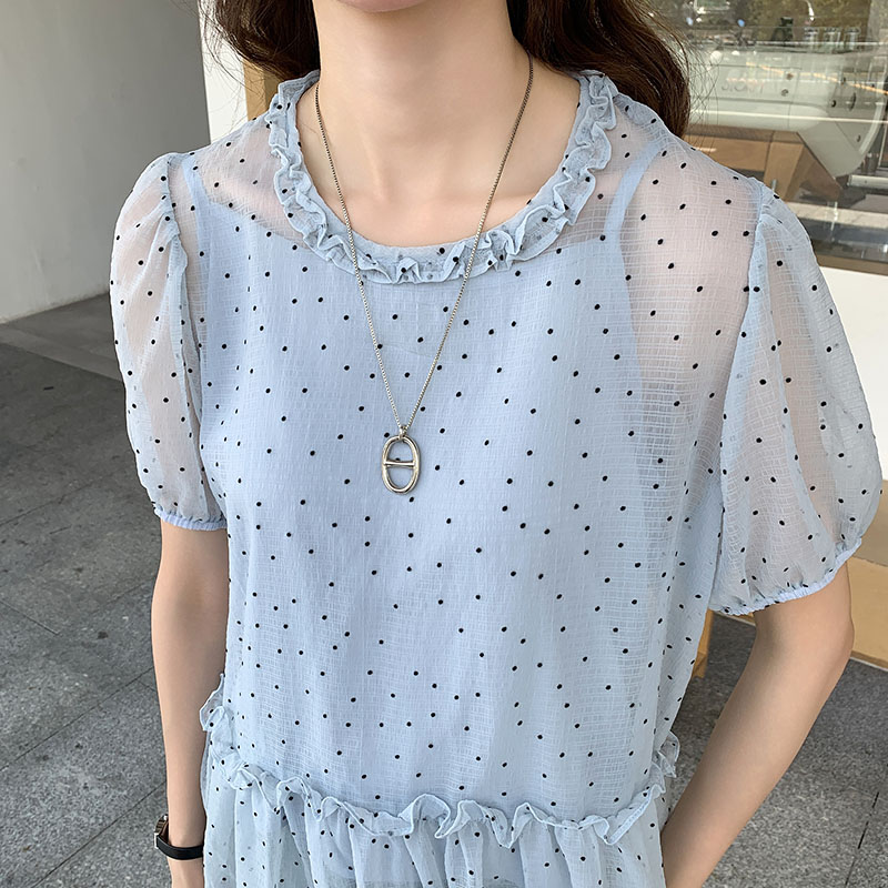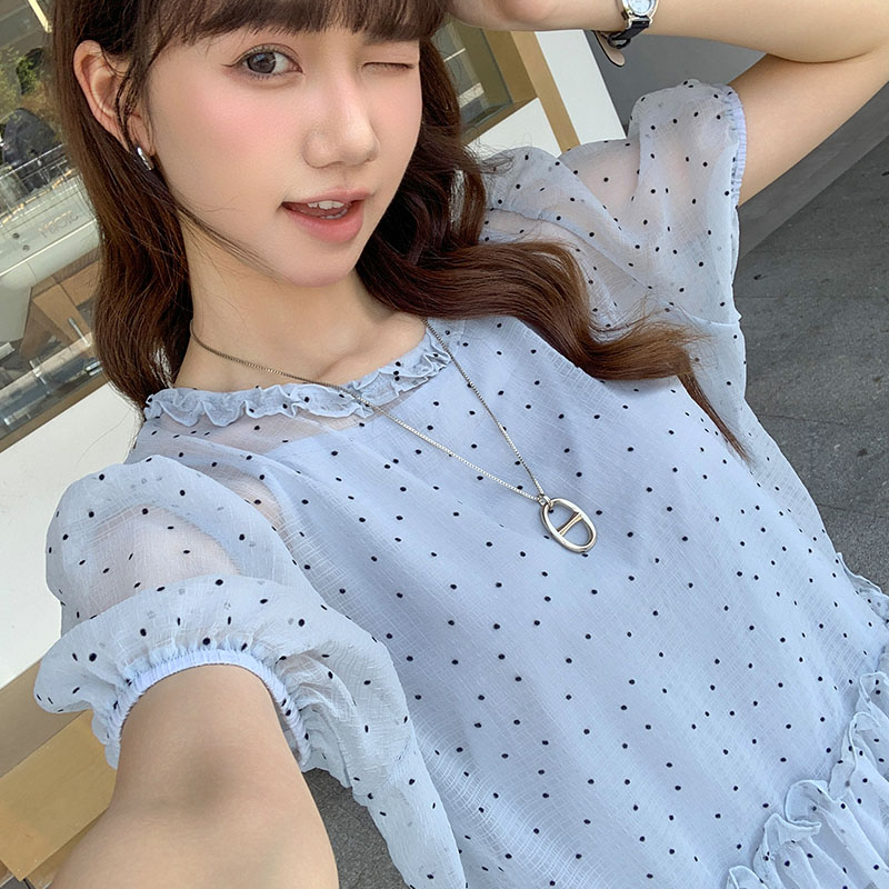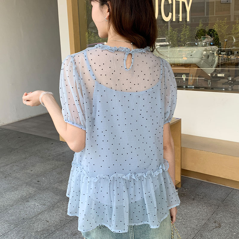 실제 가격# 둥근 목에 작은 점 작은 도트 블루 레이스 여성용 짧은 슬리브 셔츠 2025 여름 선 스크린 셔츠 2 피스 세트
