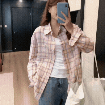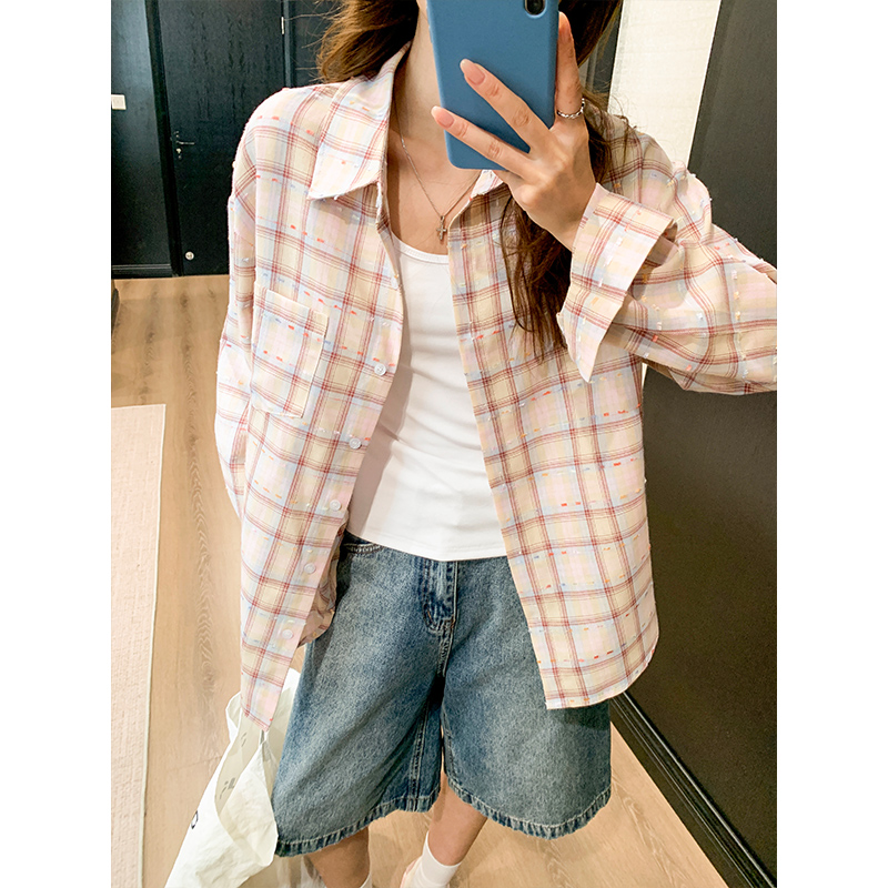 핑크색 격자 무늬 셔츠 여성 코트 여름 얇은 스타일 자외선 차단 오픈 셔츠