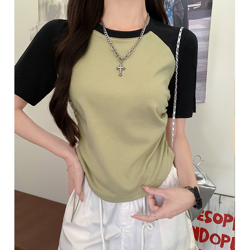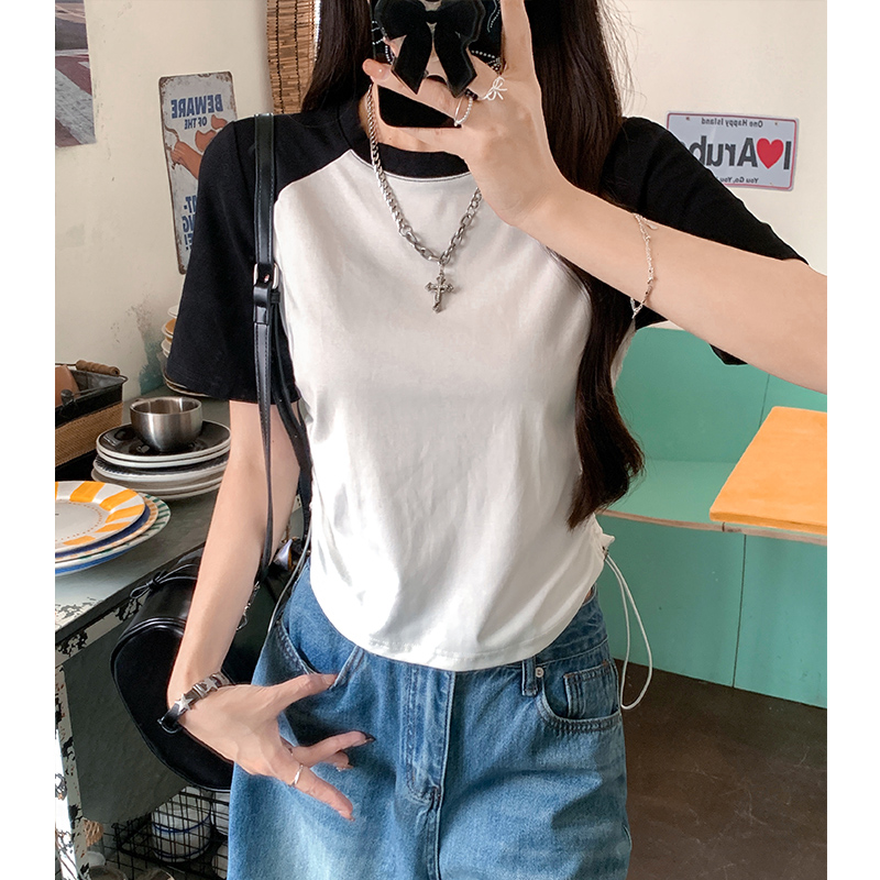실제 가격 가격#대비 색상 Raglan Sleeve Short-Sleeved 티셔츠 여름에 여성을위한 2025 년 새로운 주름 드로우 스트링 허리 짧은 상단