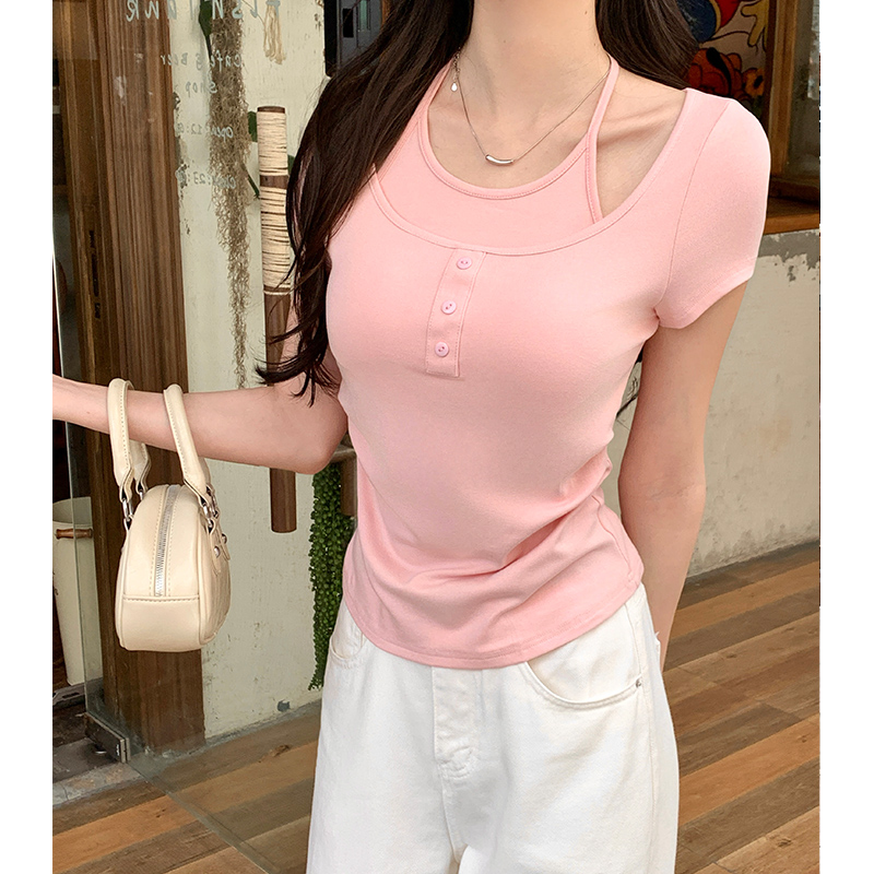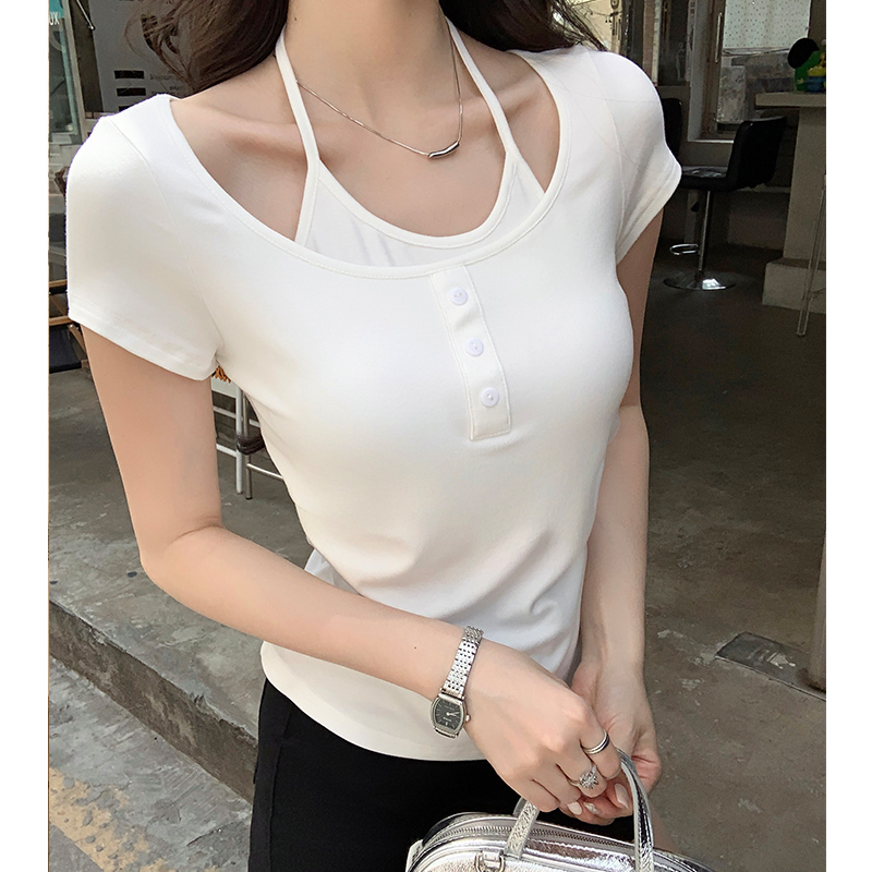 실제 가격#가짜 2 피스 프론트 어깨 어깨 단락 티셔츠 여름에 여성을위한 여성을위한 2025 년 새로운 주름 슬림 한 슬림 한 넥 홀터 탑