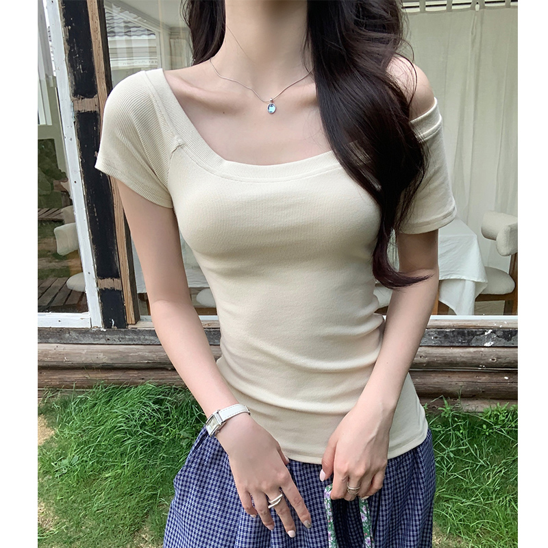 실제 가격#여름 오프 숄더 디자인에서 여성을위한 One-Shoulder Short-Sleeved 티셔츠 섹시한 순수하고 섹시한 짧은 쇄골 탑