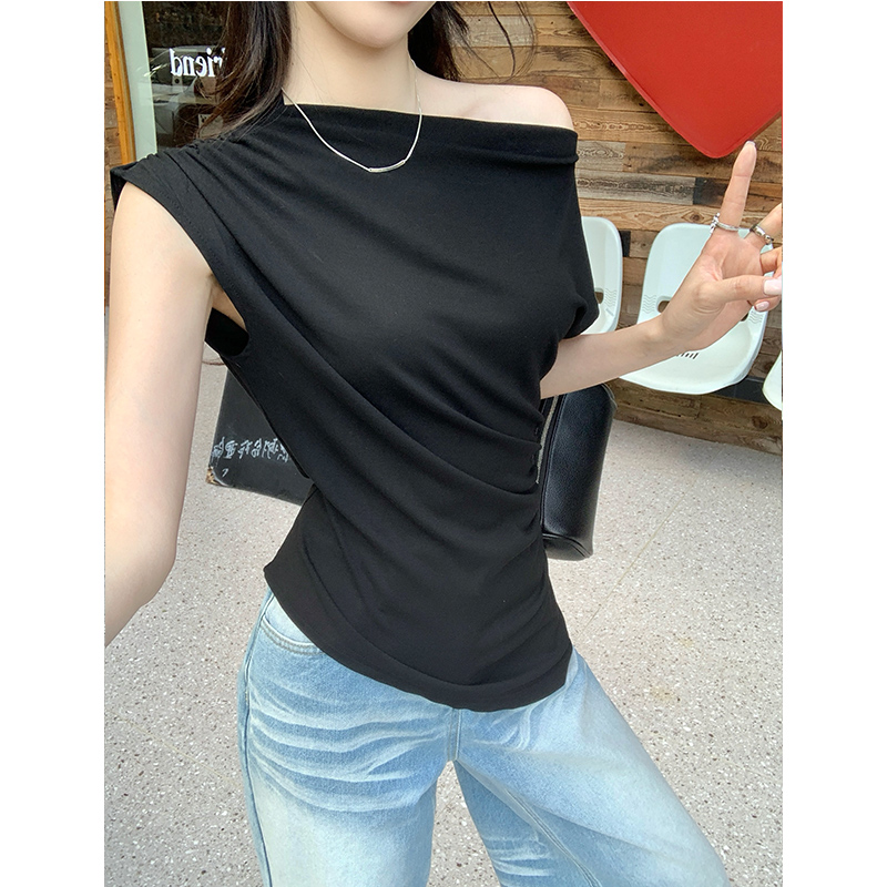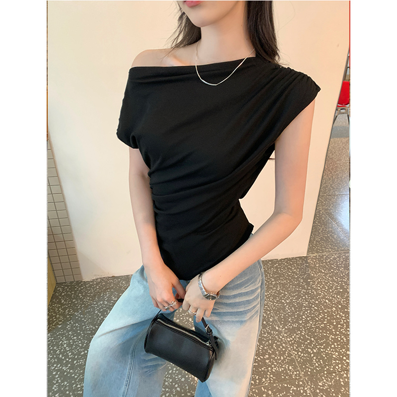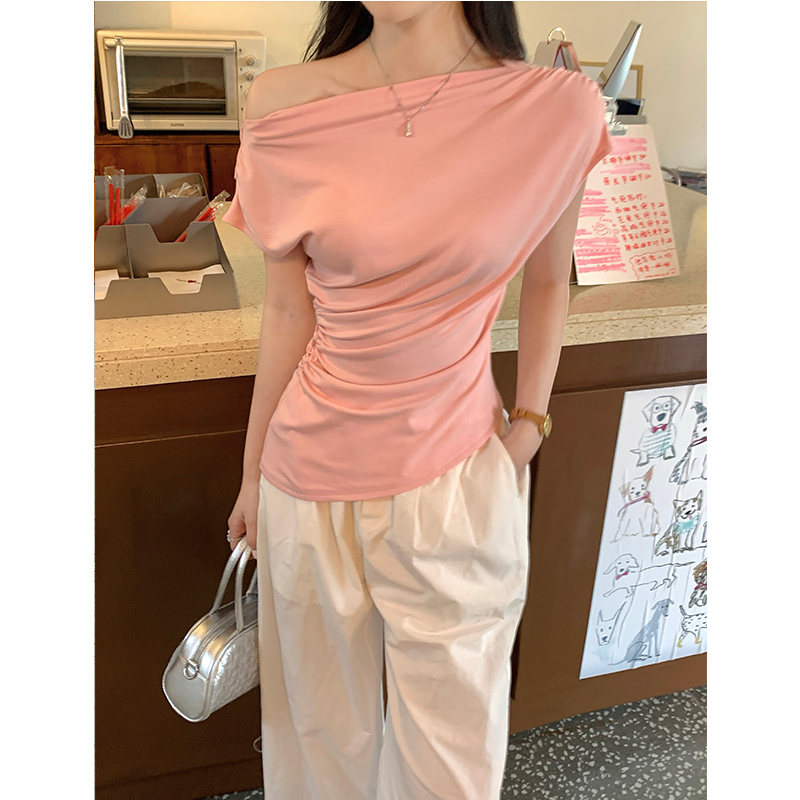 실제 가격#여성의 여름을위한 1-Shoulder 오프 숄더 짧은팔 티셔츠 2025 새로운 디자인 느낌 허리 껴안는 슬림 오프 숄더 탑