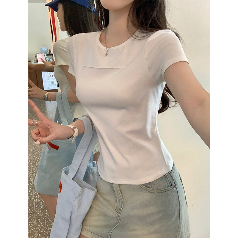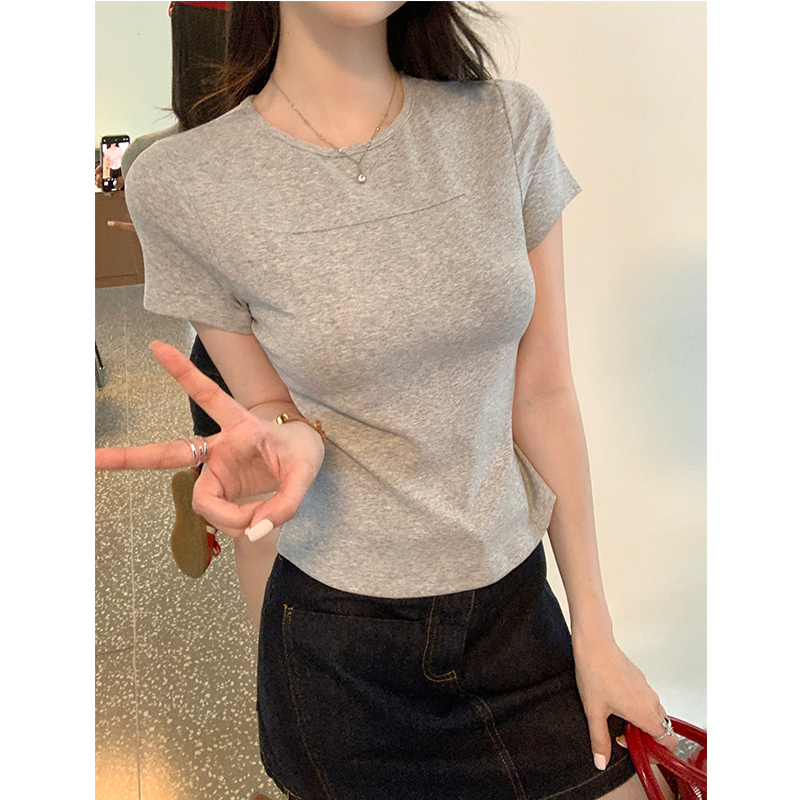 실제 샷, 실제 가격 전면 어깨 어깨 단락 티셔츠 여성을위한 2025 New Fish Bone High-End Solygol Waist-Closing Back Slit Top