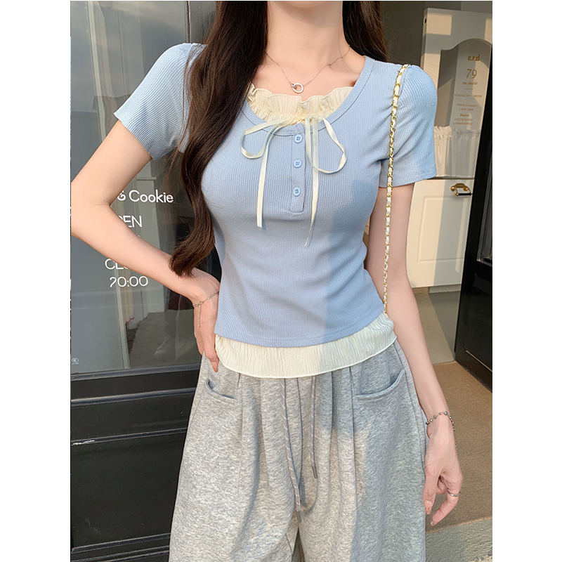 Real Shot Real Price#가짜 2 피스 짧은 슬리브 티셔츠 여성을위한 2025 여름 새로운 디자인 레이스 보우 짧은 상단