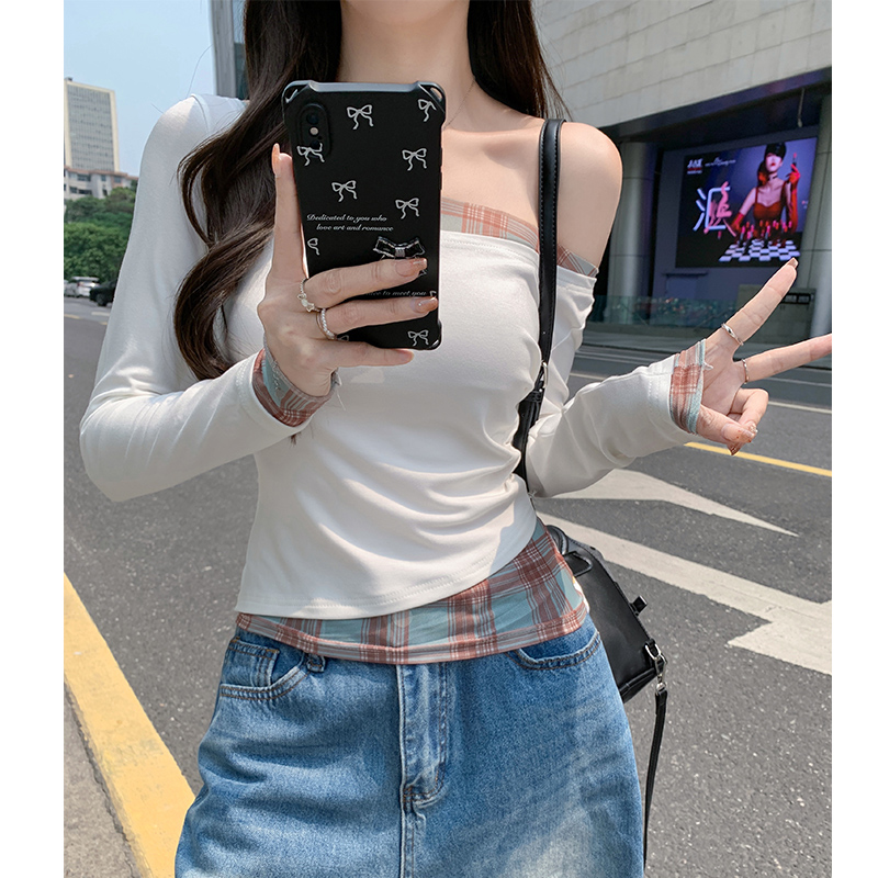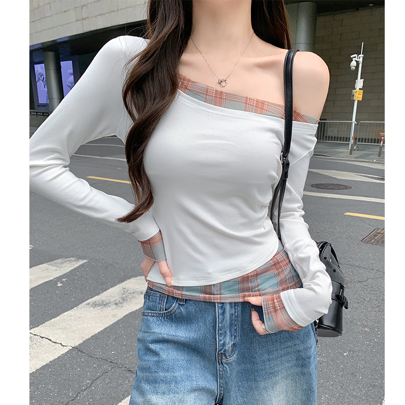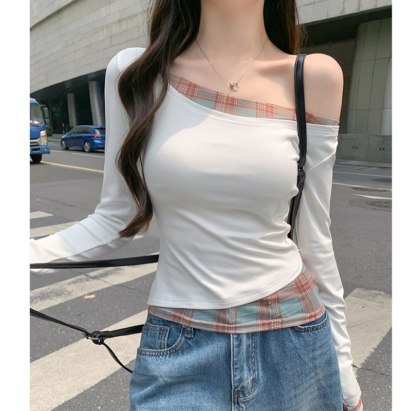 여성을위한 실제 오프 숄더 긴 소매 티셔츠 2025 여름 뉴 스타일 디자인 스 플라이 싱 된 일산 슬림 탑