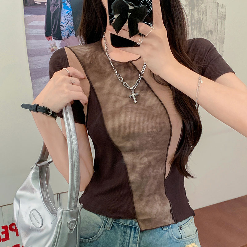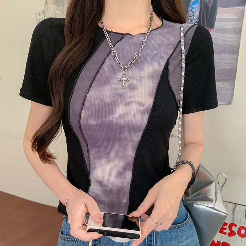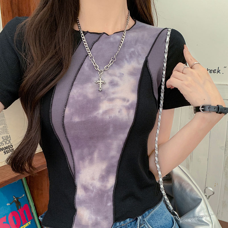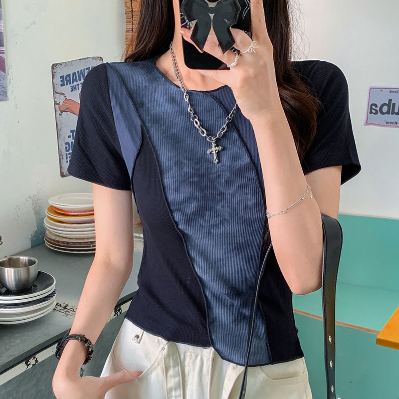 실제 샷 및 실제 가격#대비 색상 스 플라이 싱 여자 여름을위한 짧은 슬리브 티셔츠 2025 새로운 디자인 슬림 짧은 귀 탑