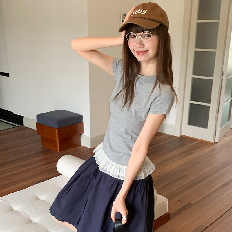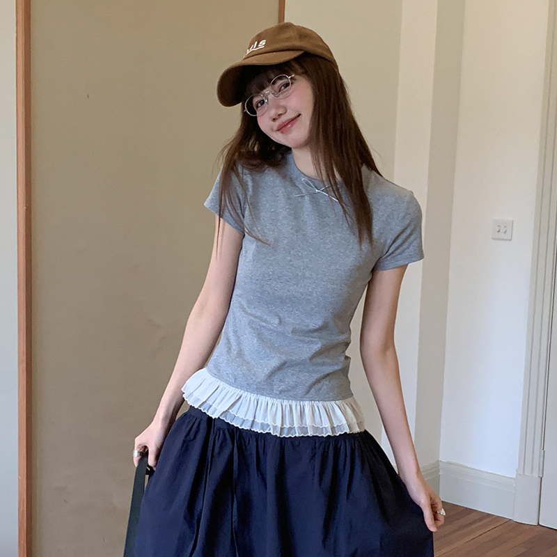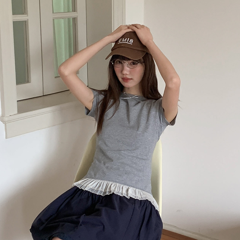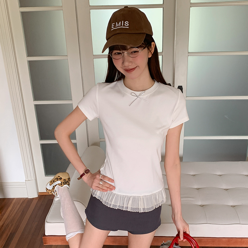 실제 가격 원형 목선 직선 어깨 어깨 단락 티셔츠 여성용 2025 New Lace Bow Slim Fit Top