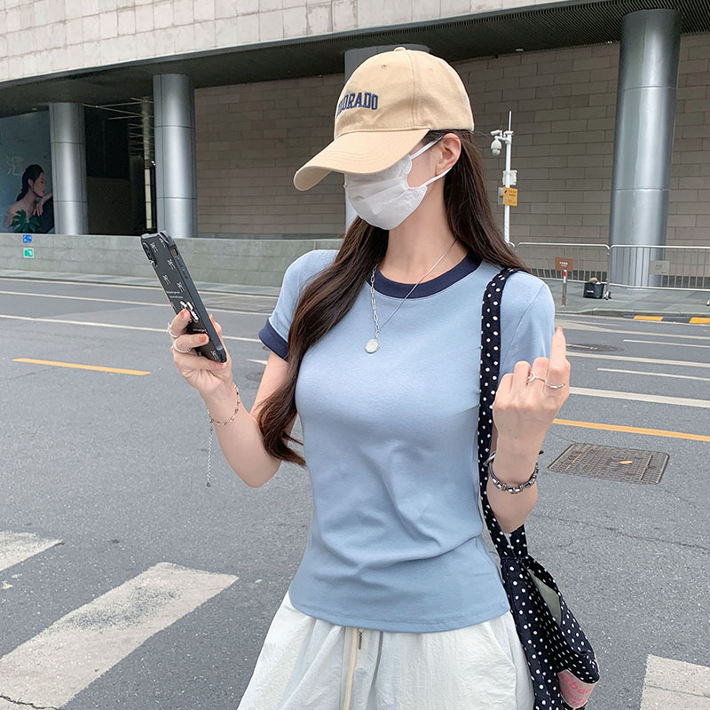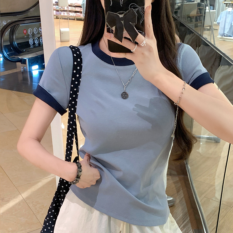 여성의 여름을위한 실제 가격 대비 컬러 프론트 어깨 단락 티셔츠 2025 새로운 디자인 다목적 슬림 핏 탑 트렌디