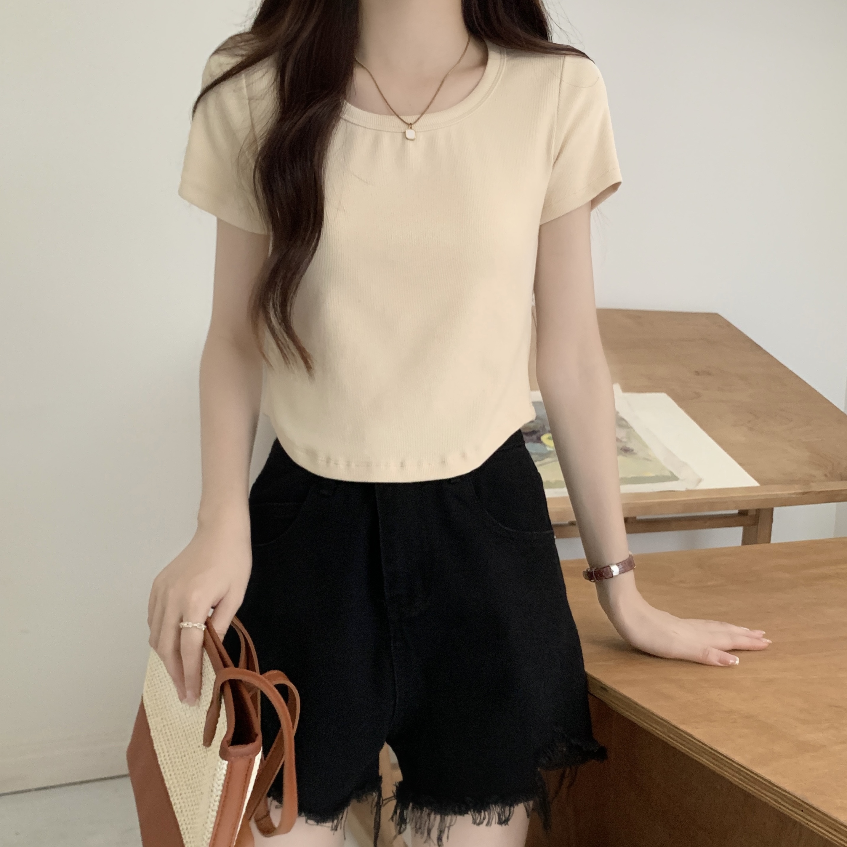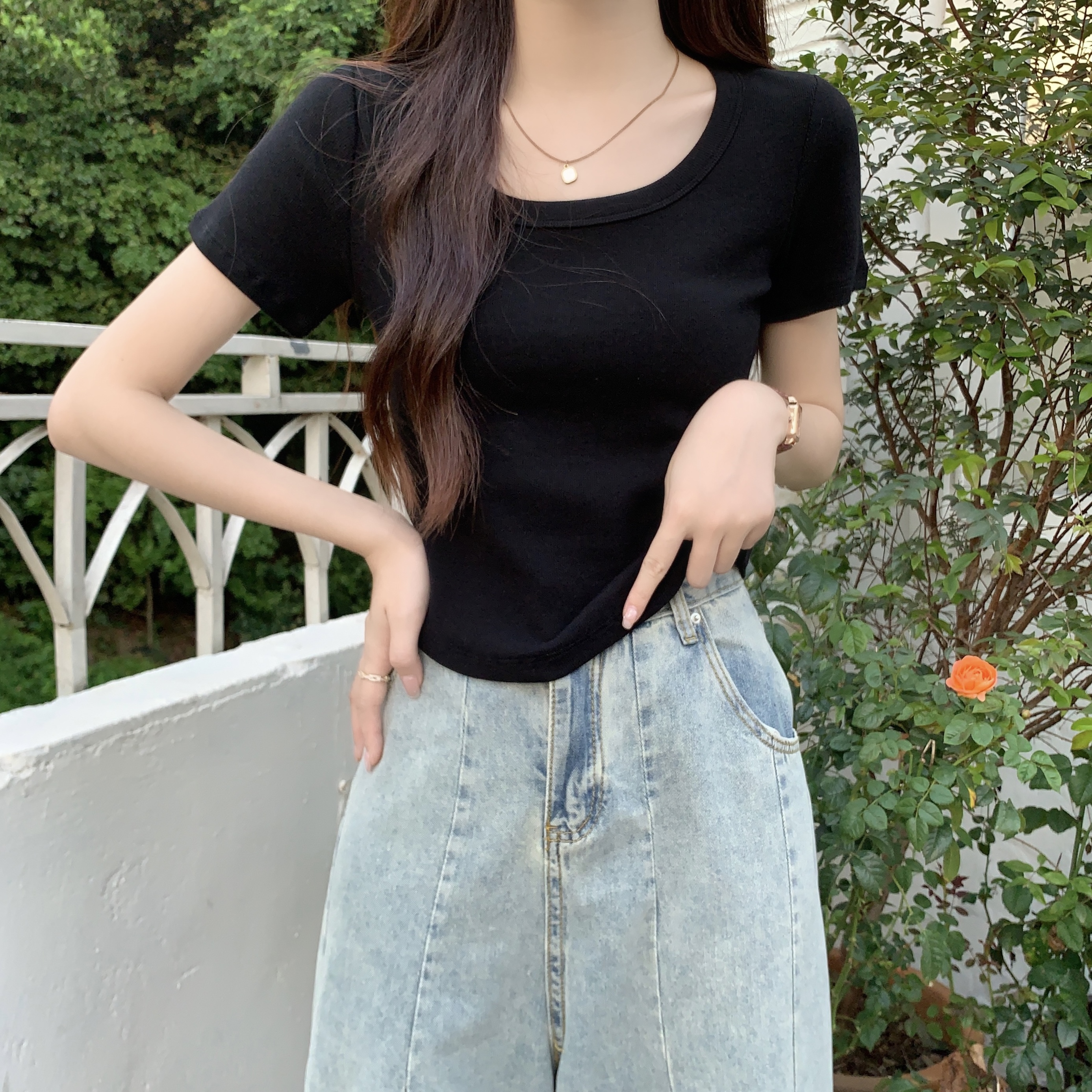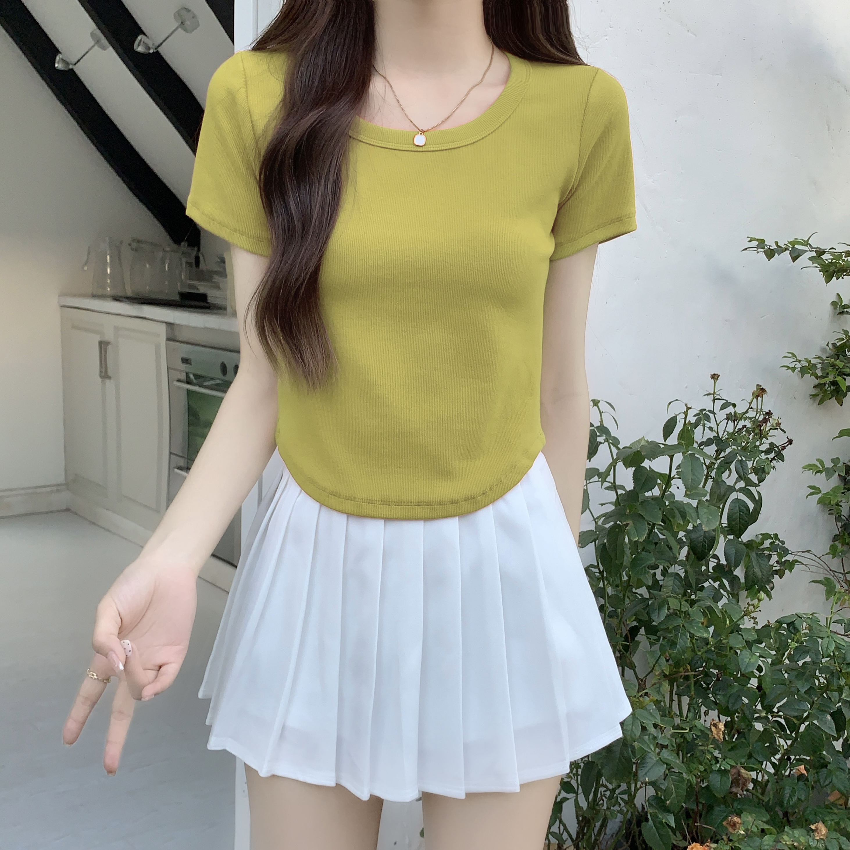 여름 도파민 디자인 슬림 한 낮은 둥근 목 상판에서 여성을위한 실제 가격 기본 단색 어깨 단락 티셔츠