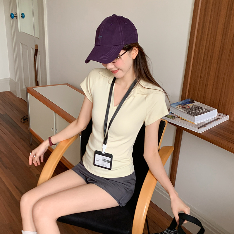 실제 가격 폴로 넥 v 목록 여성을위한 짧은팔 티셔츠 여름에 2025 년 새로운 디자인 슬림 딱지 짧은 탑