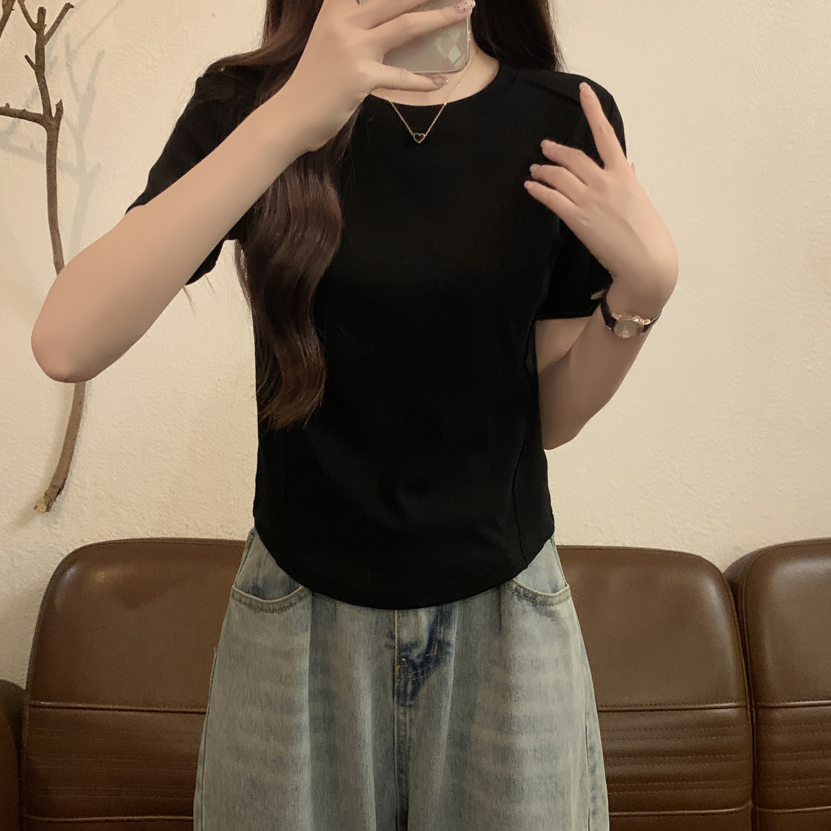 실제 샷, 실제 가격 전면 어깨 단락 짧은 슬리핑 티셔츠 여름에 여성, 새로운 디자인, 불규칙한 물고기 뼈 라인 슬림 한 탑