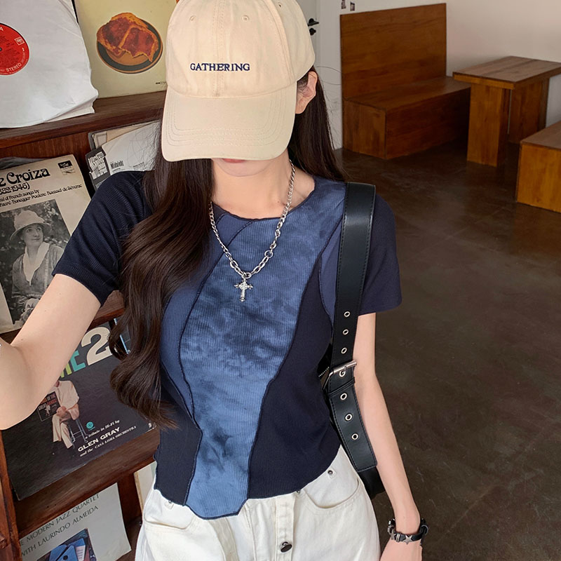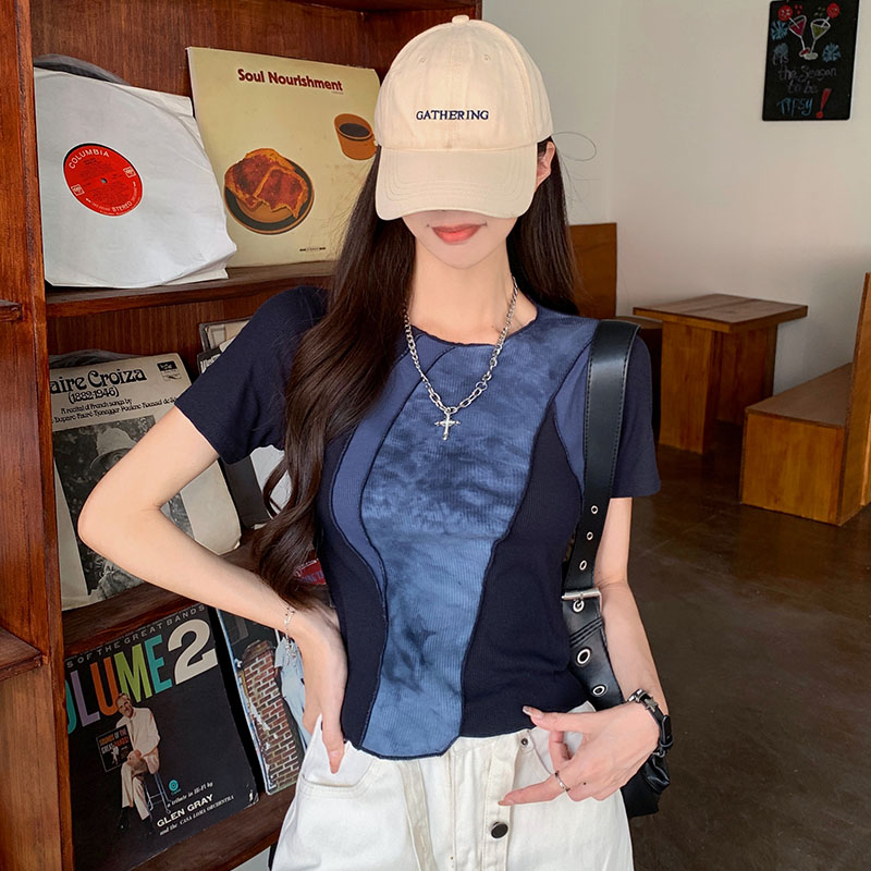 실제 샷 및 실제 가격#대비 색상 스 플라이 싱 여자 여름을위한 짧은 슬리브 티셔츠 2025 새로운 디자인 슬림 짧은 귀 탑
