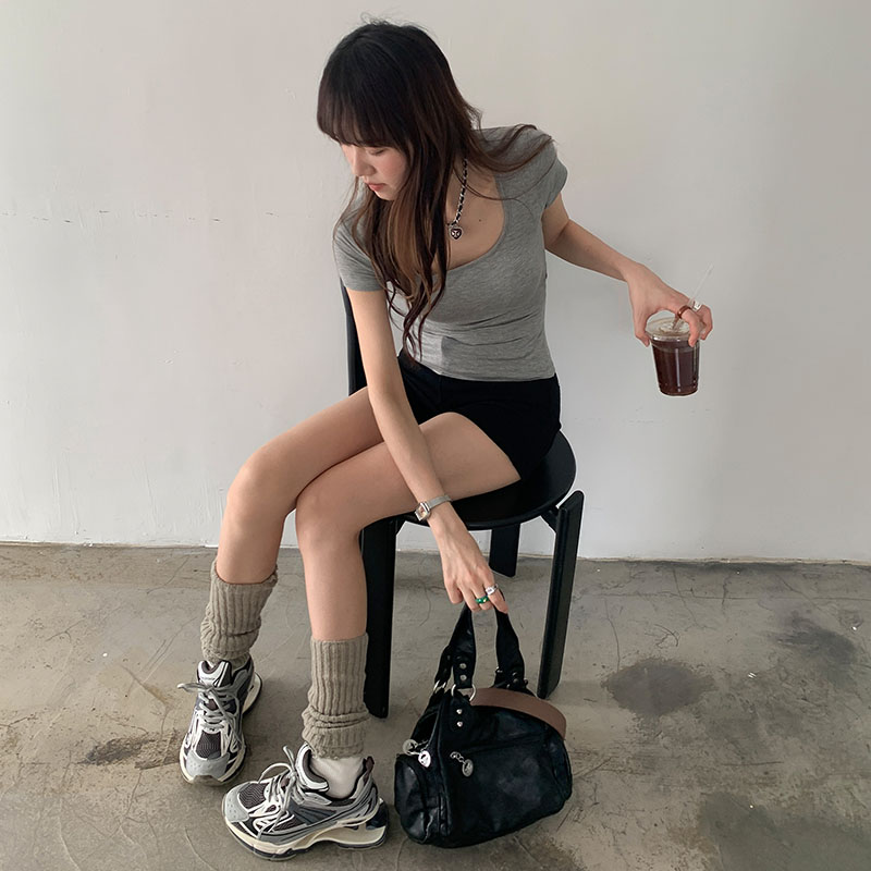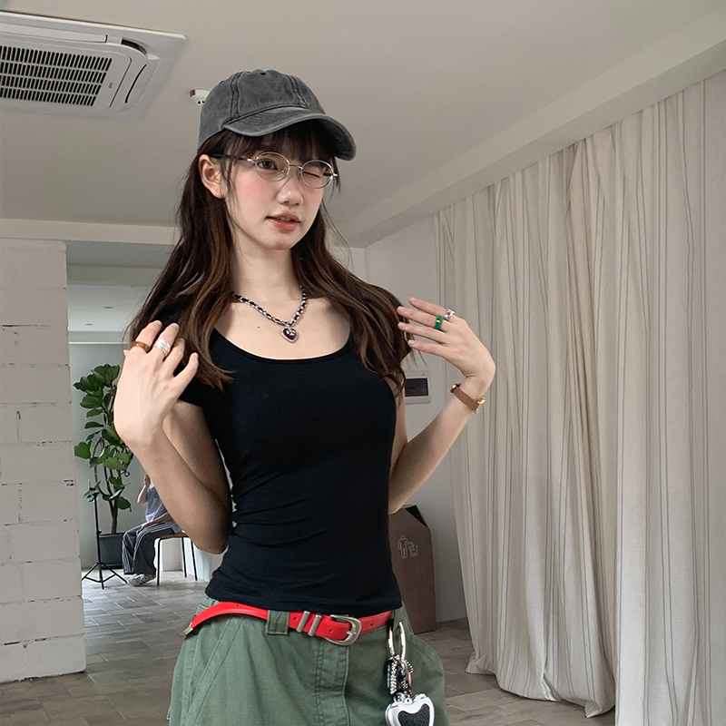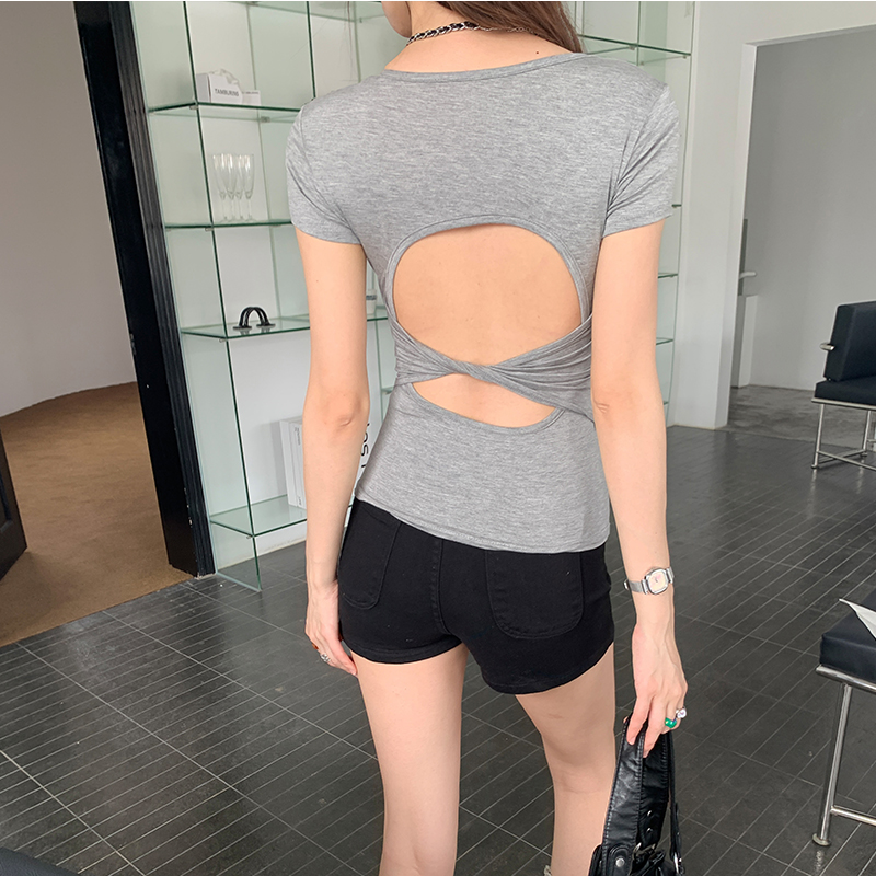 실제 가격의 사각형 칼라 단편 소매 티셔츠 여성을위한 실제 샷 2025 새로운 순수한 뜨거운 소녀 트릭 섹시한 백리스 스타킹