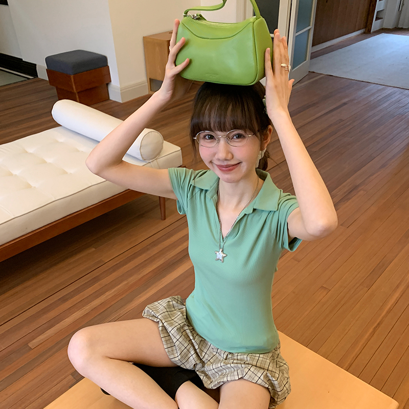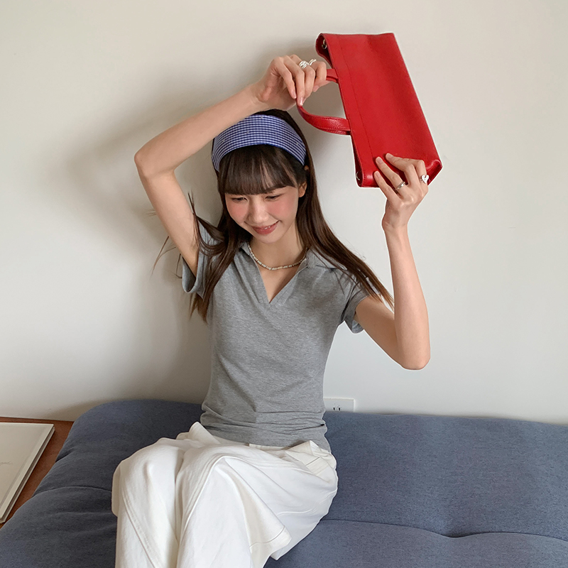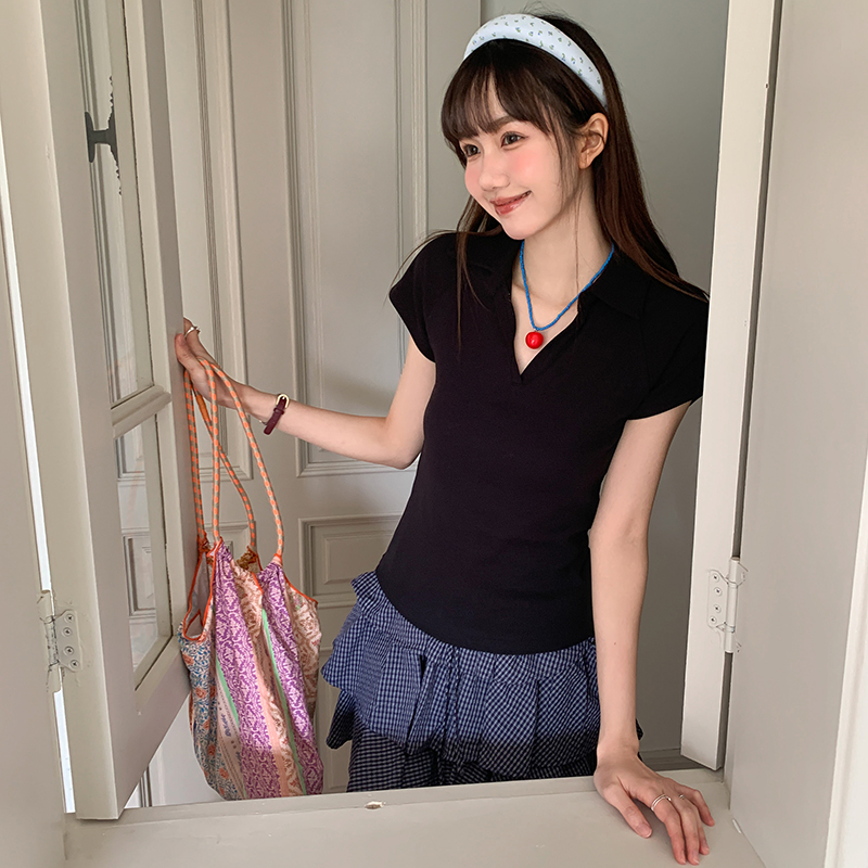 실제 가격 폴로 넥 v 목록 여성을위한 짧은팔 티셔츠 여름에 2025 년 새로운 디자인 슬림 딱지 짧은 탑